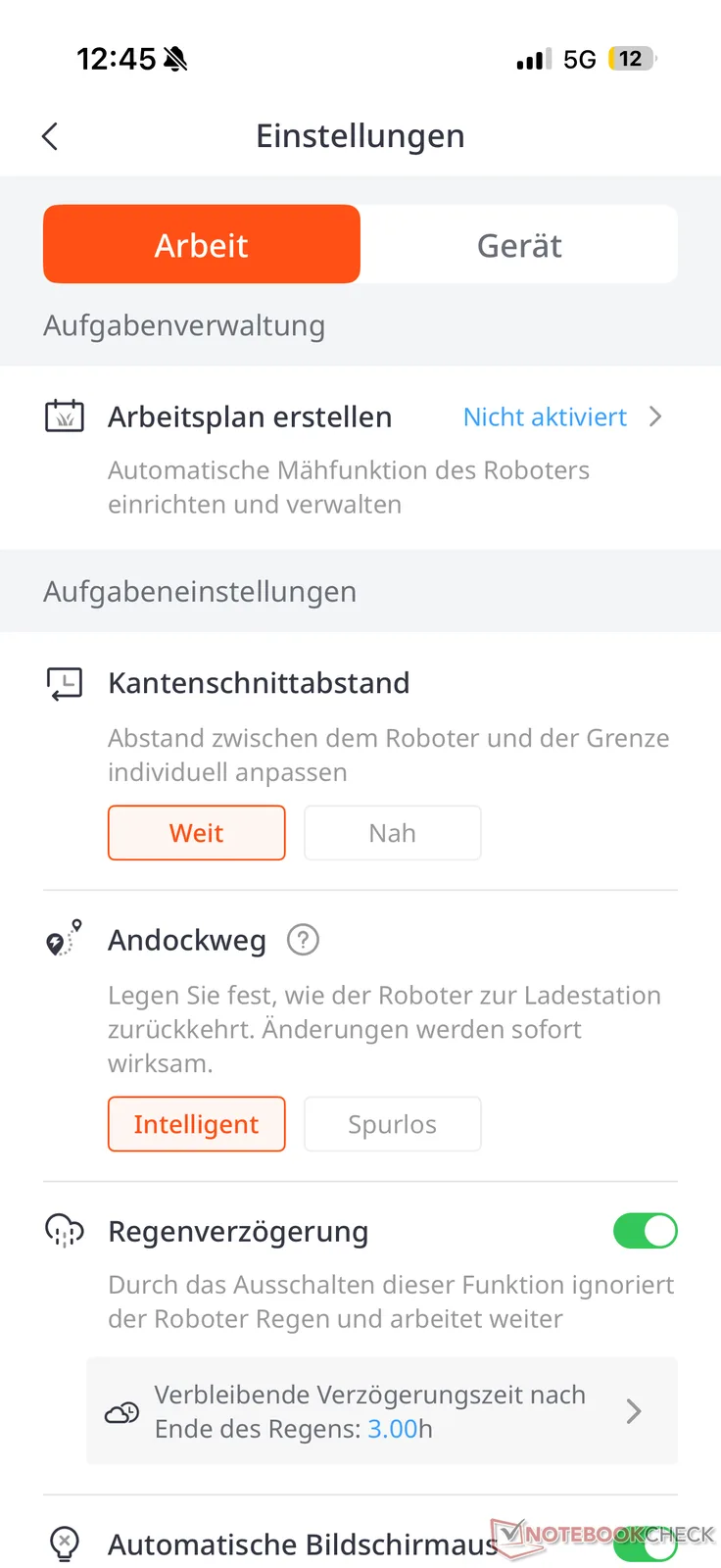 Avståndet till gräsmattans kant kan ställas in i appen mellan "Långt" och "Nära". Enligt vår praktiska erfarenhet är det cirka 5 till 10 cm för jämna övergångar med hårda kanter. Om övergången mellan gräsmattan och t.ex. rabatter utan kanter är slät kan avståndet vara ännu större. I vilket fall som helst (som med många andra robotgräsklippare) kräver detta ibland manuell efterbearbetning - särskilt eftersom avståndet mellan klippskivan och maskinens kant är ytterligare 8 cm.