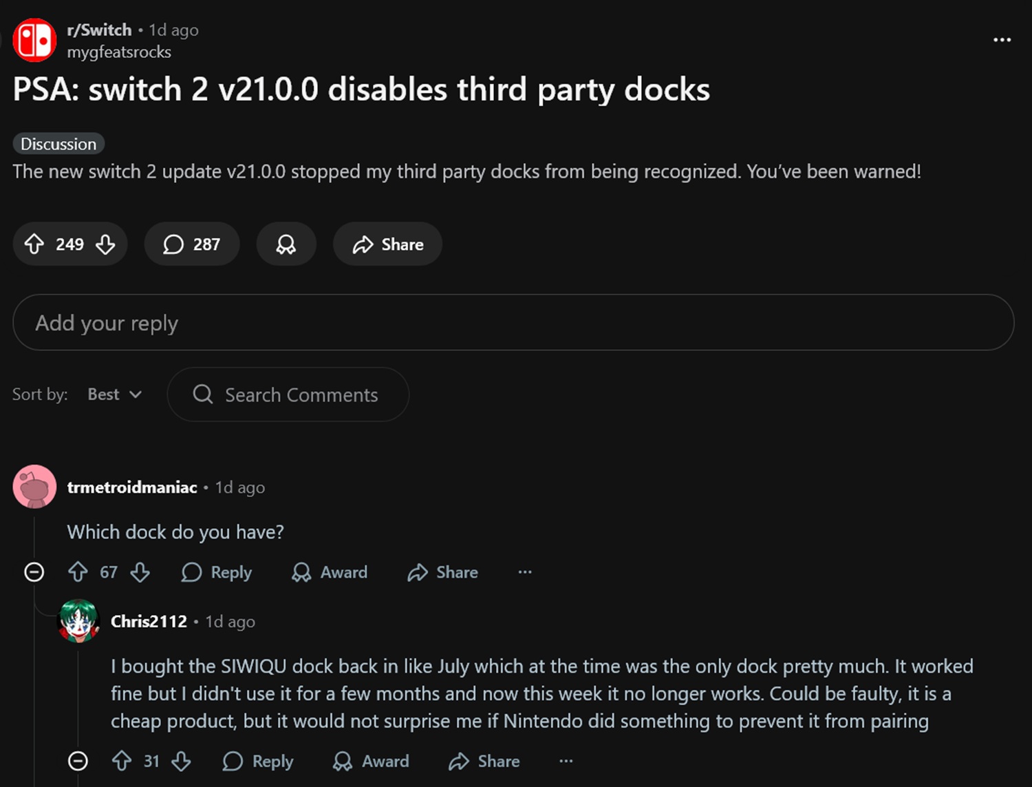 I ett exempel som publicerades på Reddit påverkades en populär Switch 2-docka från Siwiqu. Chris2112 förklarar att han köpte dockan i juli och inte hade några problem. Tyvärr, flera månader senare, är det inte längre fallet. Spelaren misstänker att Nintendos senaste firmwareuppdatering är skyldig, ett påstående som stöds av flera andra läsare.