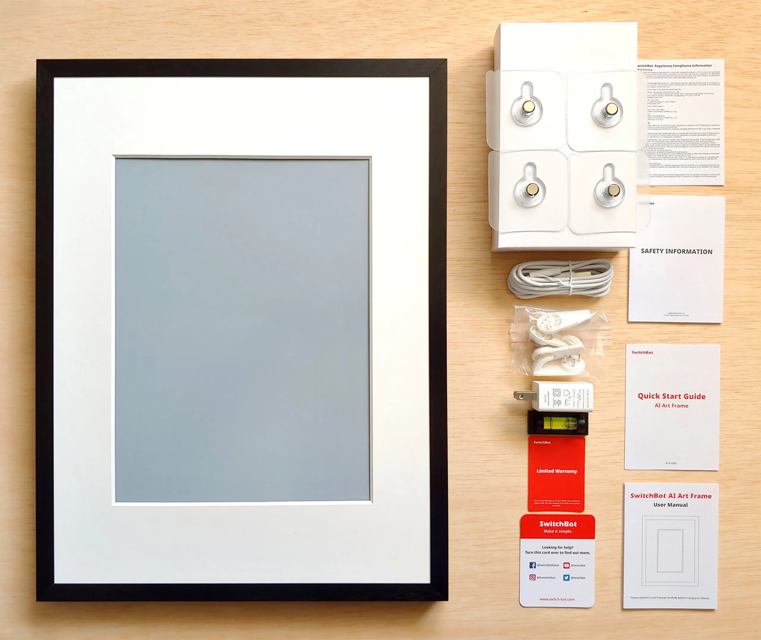 SwitchBot på 13,3 tum har en enkel design som på långt håll ser ut som ett vanligt inramat konstverk, med en E Ink Spectra 6 skärm, som har en matt yta för att minska ljusreflexer, monterad i aluminiumramen. Ramen kan väggmonteras eller placeras på skrivbord tack vare ett utfällbart stativ. USB-C-laddningsporten, anslutningsknappen och LED-statuslampan sitter på baksidan, vilket innebär att ramen måste tas bort från väggen för laddning eller installation.