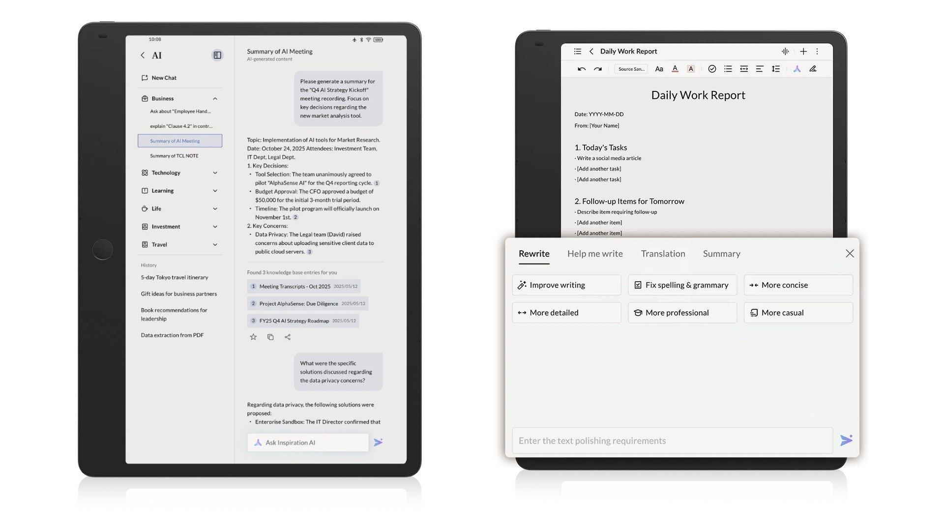 Även om TCL inte säger om enheten körs på Android, lyfter de fram några av dess programvarufunktioner. TCL Note A1 NxtPaper har stöd för multitasking med delad skärm och trådlös skärmgjutning. Den levereras med massor av AI-funktioner som AI-mötestranskription, AI-översättning i realtid, AI-sammanfattning. Det finns också Help Me Write, AI Rewrite, konvertering av handskrift till text, formeligenkänning och en oändlig canvas för konstnärer och designers.