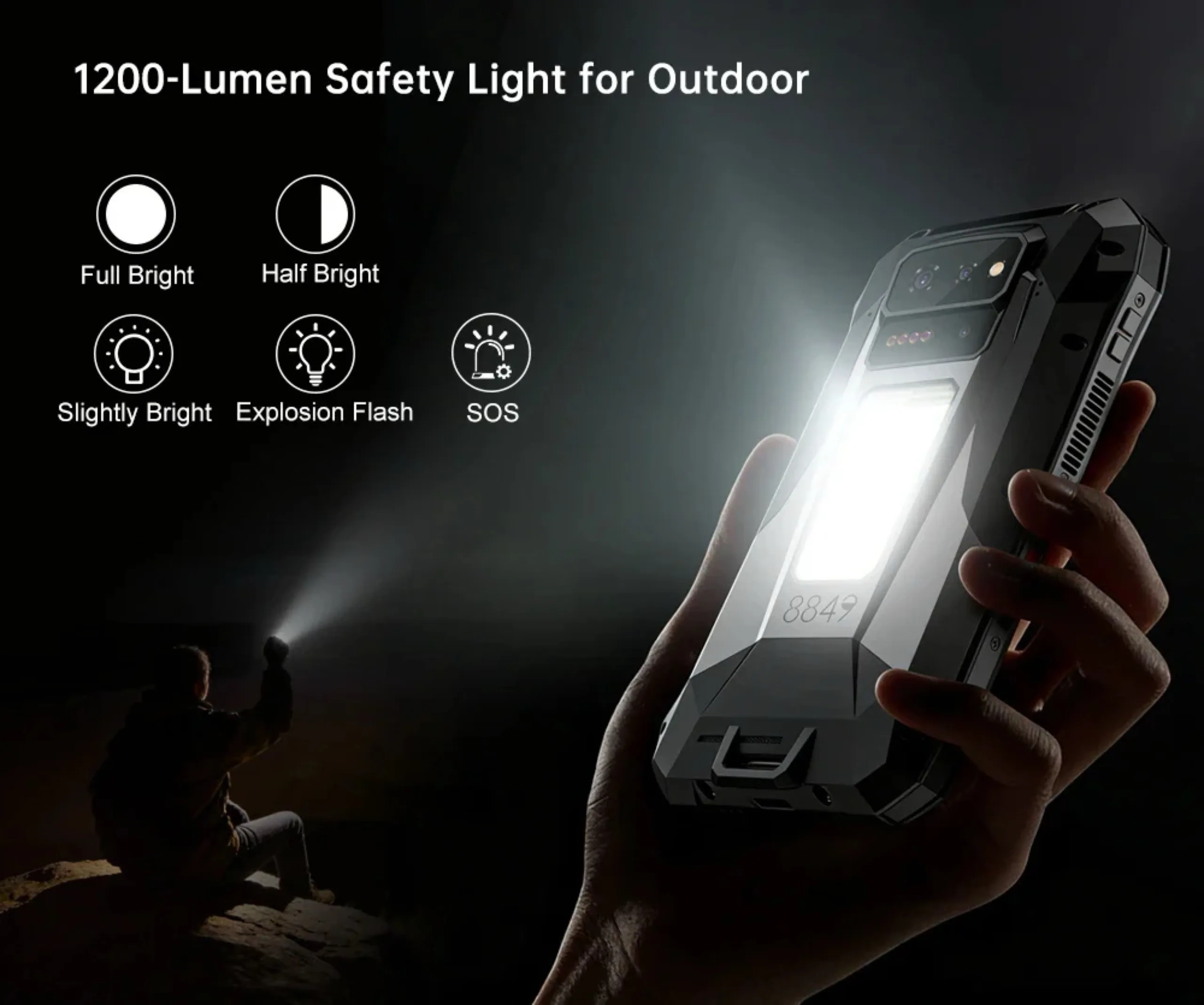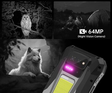 Det enorma 17.600 mAh-batteriet ger en projektortid på 5 timmar vid maximal ljusstyrka på en enda laddning. Smarttelefonen kan laddas via USB-C med upp till 120 watt, medan andra enheter kan laddas med upp till 10 watt. En annan speciell funktion är det stora campingljuset på baksidan, som har en maximal ljusstyrka på 1.200 lumen. Samtidigt är 64 megapixel nattvisionskamera ihopkopplad med fyra infraröda lysdioder så att den fortfarande kan ta bilder i fullständigt mörker.