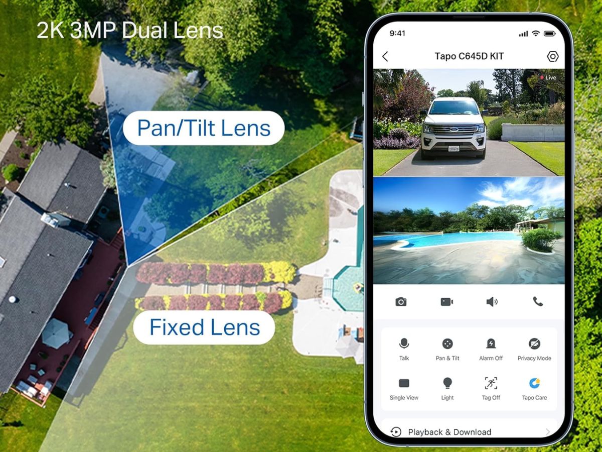 Tapos C645D har ett övre fast 2K-objektiv med 165° synfält (FOV) och ett nedre 2K pan/tilt-teleobjektiv, som automatiskt kan spåra rörliga objekt upp till 360° horisontellt och 120° vertikalt. Den smarta säkerhetskameran kan identifiera personer, fordon och husdjur, en funktion som inte kräver något abonnemang. Andra funktioner inkluderar mörkerseende i färg och anpassningsbara aktivitets- eller integritetszoner.