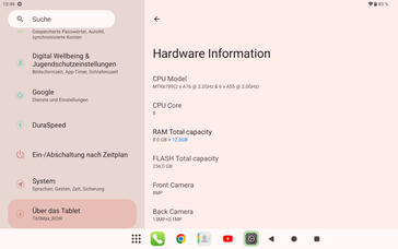 Teclast har utrustat T65 Max med 8 GB LPDDR4X RAM och 256 GB UFS 2.2-lagring. Dess RAM-minne kan utökas till upp till 20 GB, men inte fysiskt - istället via en 6 till 12 GB swap-fil i lagringsutrymmet. Eftersom detta fungerar mycket långsammare än RAM-minnet förblir denna minnesutvidgning i slutändan en marknadsföringsgimmick utan någon praktisk fördel.
