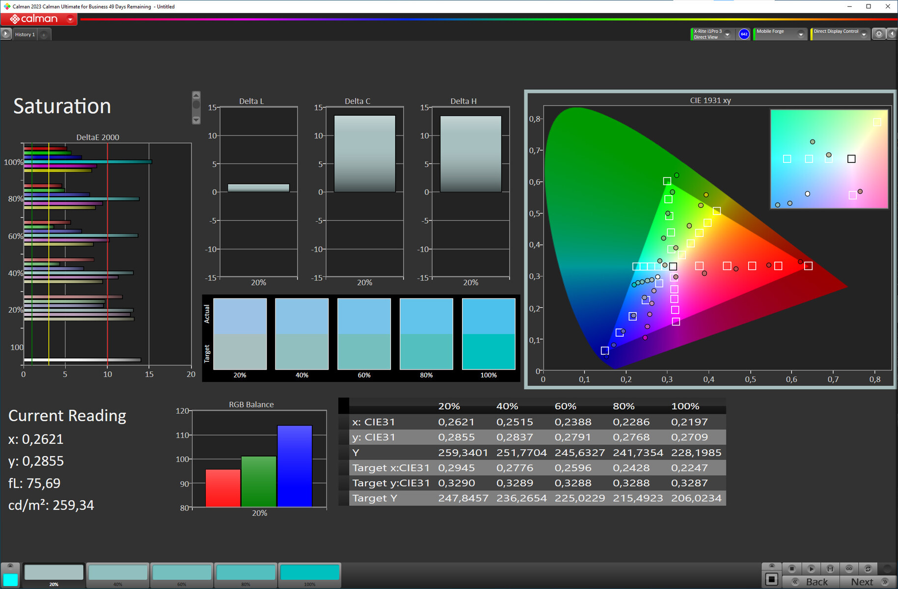 | Contrast (:1) | 945 | 1493 58% | 773 -18% | 603 -36% | 1263 34% |