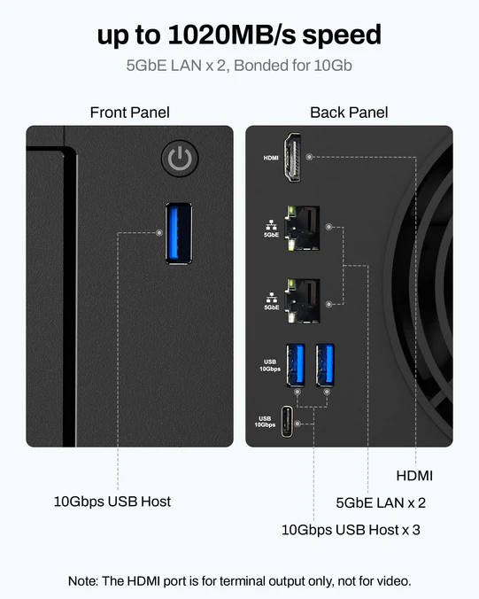 En HDMI-utgång finns tillgänglig för anslutning till en extern skärm. Båda NAS-enheterna stöder Docker, vilket gör att användarna kan köra ett brett utbud av appar. De erbjuder också omfattande säkerhetsalternativ och integration av molntjänster. Den sistnämnda funktionen ger användarna möjlighet att säkerhetskopiera sina data på molnlagring utöver lokala enheter för extra skydd.