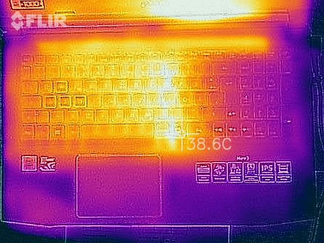The device does not heat up particularly at any load. Only one spot heated up to just over 40 °C (~104 °F) during the stress test. The device heated up a little more during the The Witcher 3 test (the game runs for one hour in FHD resolution and maximum quality settings). But temperatures are still OK.