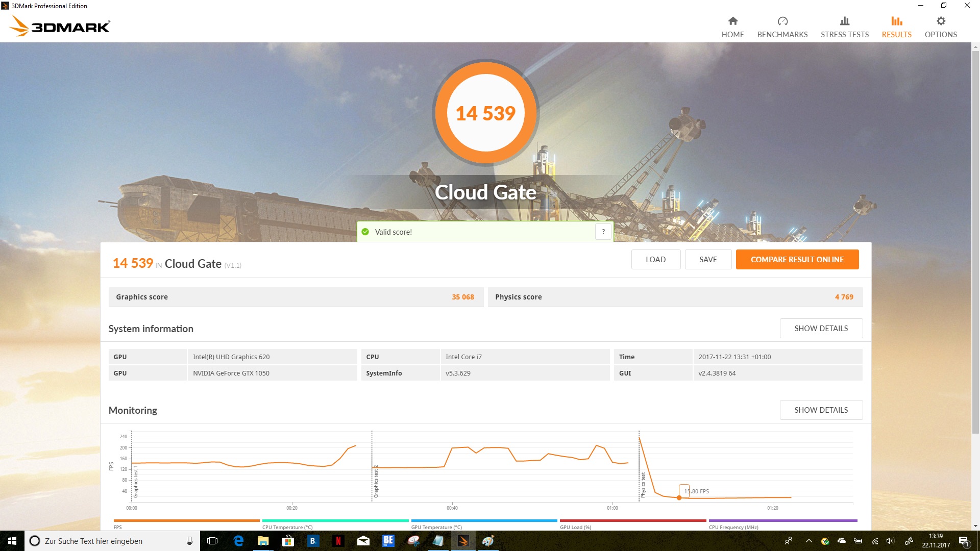 | 3DMark Cloud Gate Standard Score | 14539 poäng | |