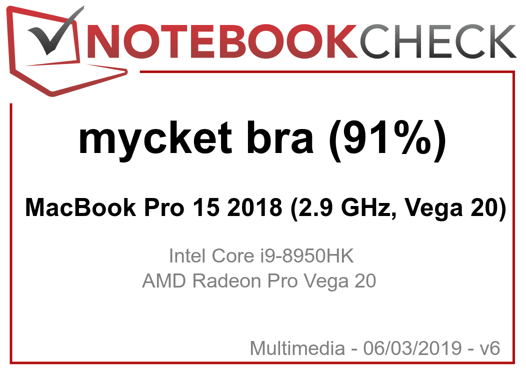 Då kvarstår frågan om huruvida MacBook Pro 15 med Radeon Pro Vega fortfarande är en multimediaenhet eller snarare en mobil arbetsstation. Det kommer definitivt att finnas användare för båda fallen och detta påverkar också utbudet av rivaler från de stora märkena Dell (antingen XPS 15 eller Precision 5530), HP (EliteBook 1050 G1 eller ZBook Studio G5) och Lenovo (ThinkPad X1 Extreme eller ThinkPad P1). Alla dessa har en aning mer CPU-prestanda men kan i de flesta fall inte hålla jämna steg med Vega 20 GPU:n. Vi anser fortfarande att MBP 15 i huvudsak är en multimediaenhet och slutresultatet på 91% drar nytta av den ökade GPU-prestandan. Omdömet hade varit annorlunda för en mobil arbetsstation (Se våra omdömeskriterier) och de arbetsstationsspecifika prestandatesterna (som vi utförde med Bootcamp Windows) hade haft mer tyngd. Slutresultatet hade ändå varit bra på 87%.