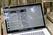 Utomhus visar sig de utmärkta testresultaten i praktiken. Det enda som sätter käppar i hjulen för utomhusbruk är den reflekterande skärmen. Jämfört med den vanliga skärmen i MacBook Pro-familjen används bara två lager i den nya konstruktionen. Enligt Apple ska det minska reflektionerna med upp till 75%. I vardagligt bruk ger skärmen ett mycket positivt intryck. När ljusstyrkan är inställd på max är reflexerna knappast något problem och det är inte heller något större problem att arbeta med datorn utomhus. När ljusstyrkan sänks till ca 50% tilltar reflexerna, men innehållet på skärmen förblir läsbart. Det finns ingen matt version av Retinaskämen, även om många användare säkert skulle uppskatta en. En annan funktion är att skärmen är utrustad med en ljussensor som justerar styrkan automatiskt.