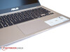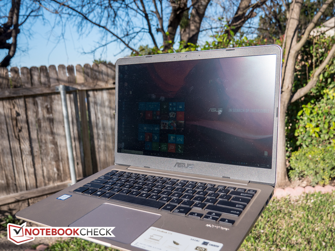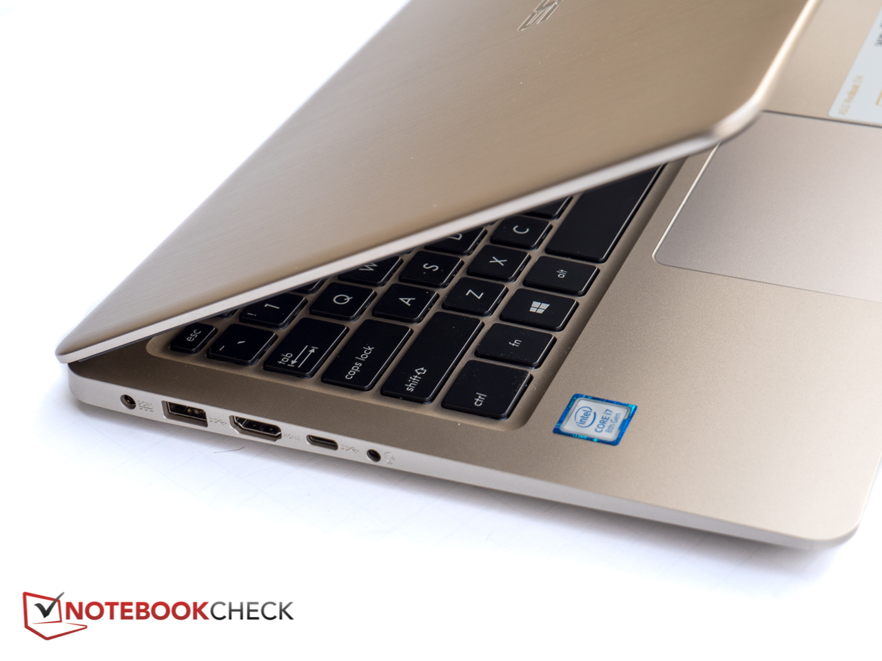 VivoBook S14 S410UQ-NH74 kommer med en Full HD-skärm på 14 tum och ett 13.3 tums chassi. Tyvärr är skärmen inte särskilt ljusstark och lider av oexakt färgåtergivning samt medelmåttig täckning av dom professionella färgrymderna. Med det sagt: IPS-skärmen är utan tvekan en värdig uppgradering över den HD TN-skärm som VivoBook S14 S406UA är utrustad med. Även om laptopen onekligen ser tjusig ut med sin smidiga metall och plastdesign så böjer sig tangentbordsplattan för mycket för att vara bekväm redan vid en måttlig mängd tryck. Som ett resultat är skrivupplevelsen inte i närheten av så praktisk som den hade kunnat vara. Systemprestandan är hyfsad, men vi stötte på kraftig strypning vid maximal belastning, då designen med ett enkelt värmerör / enkel fläkt inte riktigt håller jämna steg med värmeutvecklingen. Vi ifrågasätter också Asus val att kombinera en 8:e generationens i7-CPU med ett utdaterat instegs-grafikkort. Många konkurrerande modeller använder redan det mycket kraftfullare MX150 istället.