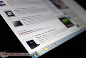 Den icke-reflekterande ytan och den utmärkta ljusstyrkan (som är lika hög när man kör på batteri) gör det möjligt att använda datorn utomhus - även i solljus. De extrema betraktningsvinklarna gör att IPS-panelen saknar konkurrens. Man får vara försiktig i offentliga utrymmen, för det syns långt och brett vad som står på skärmen.
