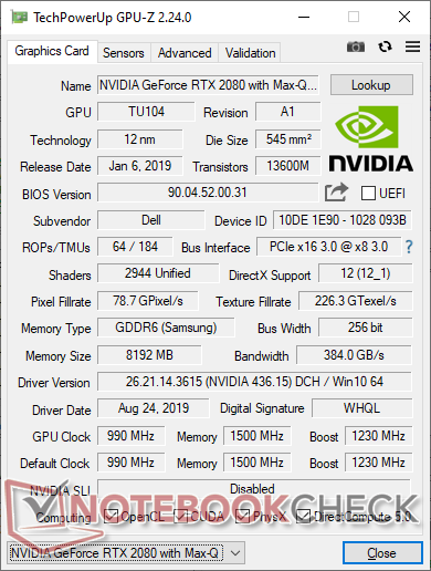 | Alienware m15 R2 P87F i7-9750H, GeForce RTX 2080 Max-Q, 2x Toshiba XG6 KXG60ZNV512G (RAID 0), IPS, 1920x1080, 15.6" | Alienware m15 P79F i7-8750H, GeForce RTX 2070 Max-Q, Toshiba XG5 KXG50ZNV512G, OLED, 3840x2160, 15.6" | Razer Blade 15 RTX 2080 Max-Q i7-9750H, GeForce RTX 2080 Max-Q, Samsung SSD PM981 MZVLB512HAJQ, IPS, 1920x1080, 15.6" | Lenovo Legion Y740-15ICHg i7-8750H, GeForce RTX 2070 Max-Q, Samsung SSD PM981 MZVLB256HAHQ, IPS, 1920x1080, 15.6" | MSI GP65 Leopard 9SE-225US i7-9750H, GeForce RTX 2060 Mobile, Toshiba KBG30ZMT512G, IPS, 1920x1080, 15.6" | Alienware 15 R3 Max-Q i7-7820HK, GeForce GTX 1080 Max-Q, LiteOn CX2-8B256, IPS, 1920x1080, 15.6" | |