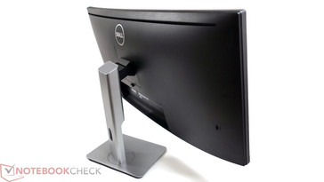 U3415W har ett utseende som känns igen från andra Dellskärmar, en kombination av silver och svarta ytor. Ytan består av plast, men den känns ändå högkvalitativ enligt testaren. Vi kunde inte hitta några brister i tillverkningskvaliteten. Skärmen imponerar utseendemässigt med sin enorma storlek på 34 tum och den övre panelens kant-till-kant-konstruktion förstärker det intrycket. Egentligen visas bilden ytterligare 10 mm (~ 0,4 tum) inåt, vilket resulterar i en faktisk skärmstorlek på 31,43 tum (798 mm).
