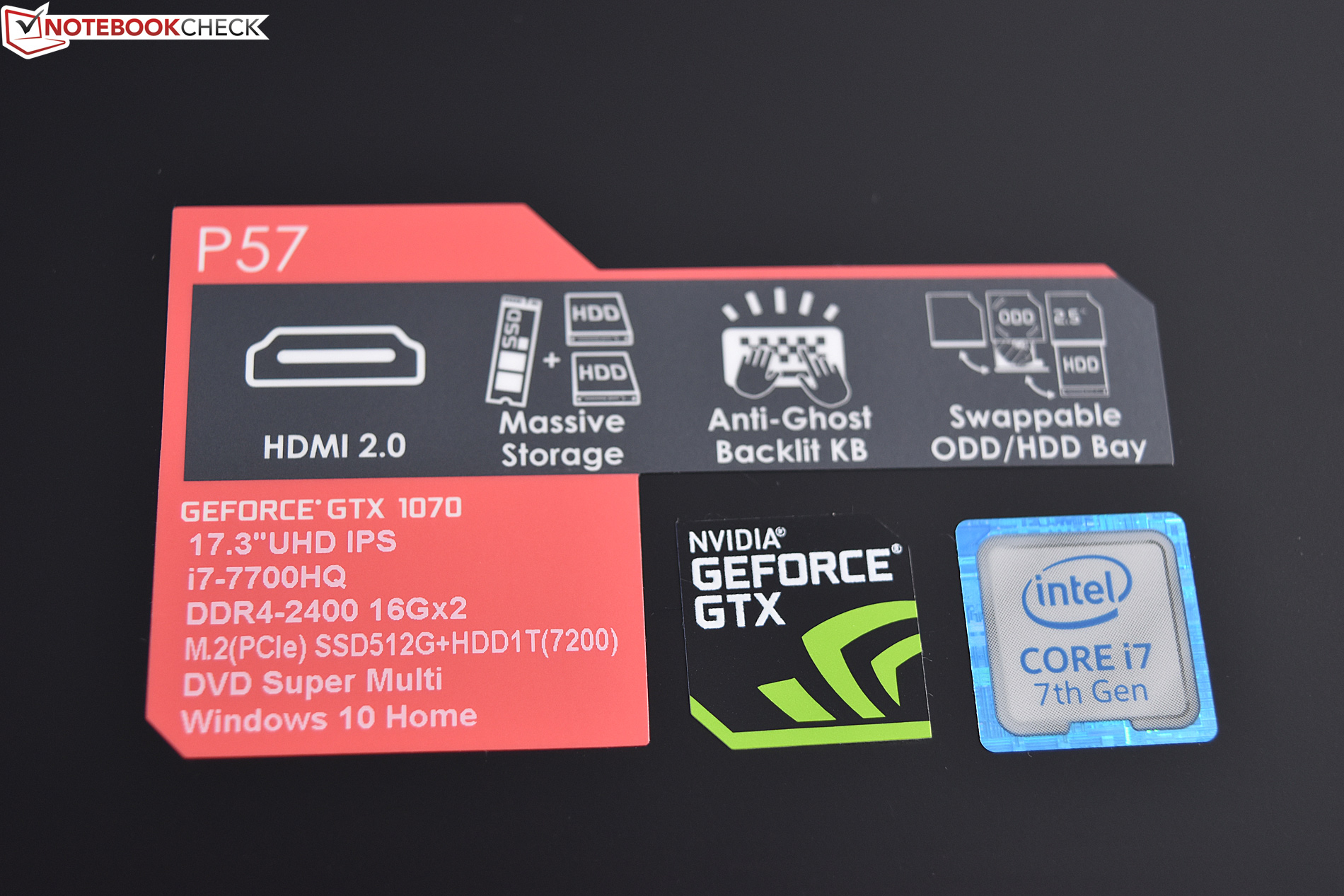 | Gigabyte P57X v7 i7-7700HQ, GeForce GTX 1070 Mobile, Transcend MTS800 256GB M.2 (TS256GMTS800), IPS, 3840x2160, 17.3" | Gigabyte P57X v6 6700HQ, GeForce GTX 1070 Mobile, Transcend MTS800 256GB M.2 (TS256GMTS800), IPS, 1920x1080, 17.3" | Acer Predator 17 G9-793-77LG 6700HQ, GeForce GTX 1070 Mobile, Toshiba NVMe THNSN5256GPU7, IPS, 3840x2160, 17.3" | MSI GT73VR 7RF-296 i7-7820HK, GeForce GTX 1080 Mobile, 2x Samsung SM951 MZVPV256HDGL (RAID 0), TN LED, 1920x1080, 17.3" | EVGA SC17 GTX 1070 6820HK, GeForce GTX 1070 Mobile, Samsung SM951 MZVPV256 m.2, IPS, 3840x2160, 17.3" | |