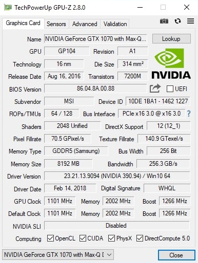 | MSI GS65 8RF-019DE Stealth Thin GeForce GTX 1070 Max-Q, i7-8750H | MSI GS63VR 7RG-005 GeForce GTX 1070 Max-Q, i7-7700HQ | Gigabyte Aero 15X v8 GeForce GTX 1070 Max-Q, i7-8750H | Asus Zephyrus M GM501 GeForce GTX 1070 Mobile, i7-8750H | Acer Predator Triton 700 GeForce GTX 1080 Max-Q, i7-7700HQ | Genomsnitt av klass Gaming | |