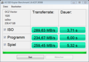 I AS SSD:s kopieringstest får vi med Vector precis som med Samsung 840 Pro inga enhetliga resultat. I bästa fall är Vector något snabbare än Samsung 840 Pro i alla deltester, men dess svagaste resultat ligger klart lägre än de svagaste resultaten från 840 Pro.