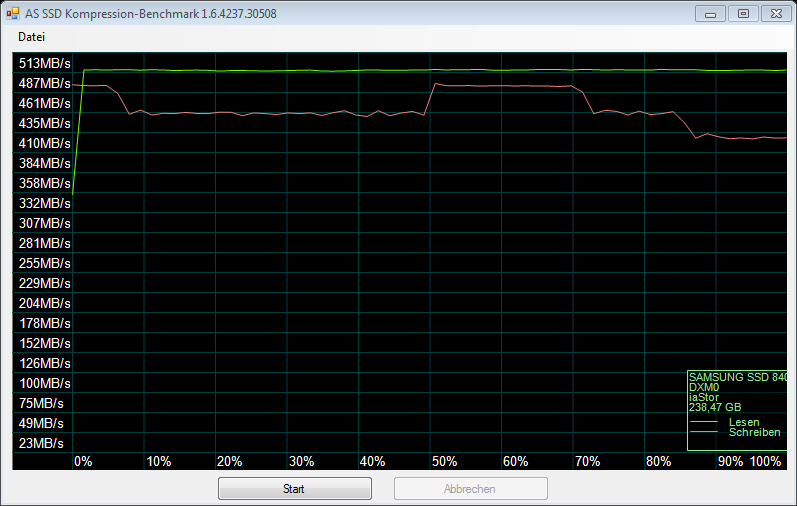 I dagens läge utgör SATA-gränssnittet med sina 6 Gbps ett tak för de sekventiella överföringshastigheterna i moderna SSD-enheter. För att nå högre måste du använda RAID eller PCI Express. I AS SSD benchmark – ett mångsidigt och användbart test, men med stora felmarginaler – kommer vår Vertex 450 upp i 506 MB/s vid sekventiell läsning, vilket mer eller mindre är inom felmarginalen jämfört med andra toppmodeller.