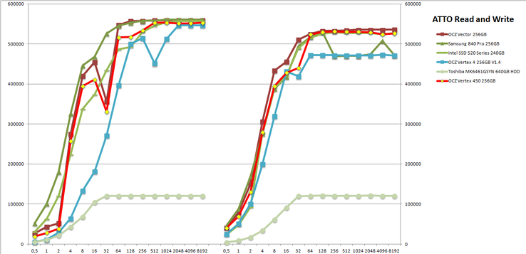 Accesstiderna är minimala med vilken modern SSD som helst om man jämför med mekaniska hårddiskar. Vertex 450 matchar inte Vector vid läsning, men hastigheterna är närmast identiska vid skrivning.