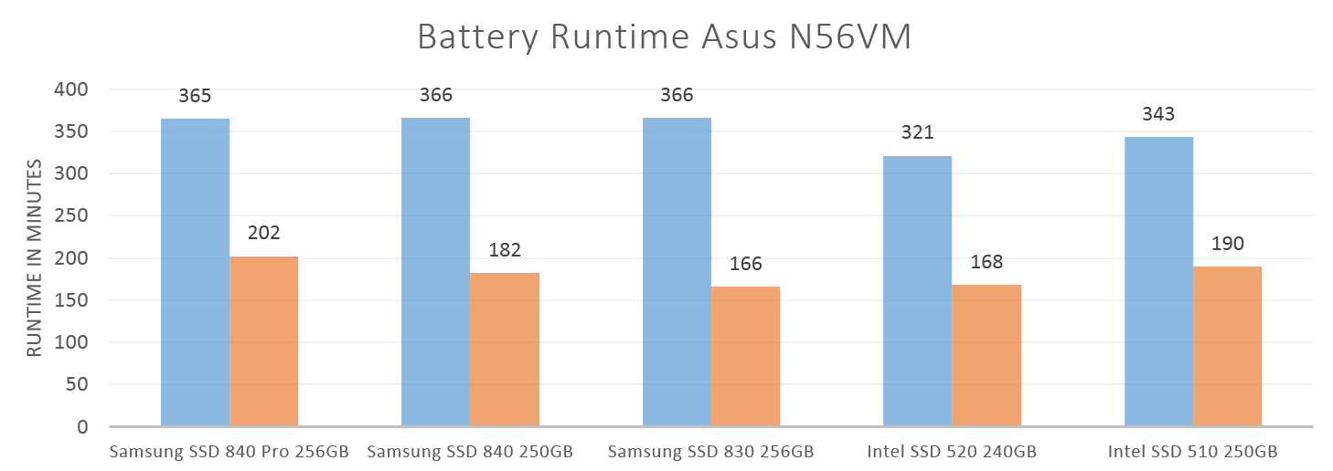För att mäta effekten på batteritiden installerar vi även diskarna som systemdisk i den bärbara datorn Asus N56VM. Vi använder Battery Eater för att få fram den maximala batteritiden (med WLAN) och IOMeter (IOMix) för att testa hur batteritiden påverkas av en SSD i arbete.