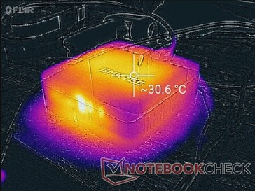 Yttemperaturen är generellt sett varmare än på de flesta andra minidatorer eftersom NucBox 3 inte har någon intern fläkt. Vid hög belastning under längre perioder kan den övre ytan bli så varm som 50 C jämfört med 30 C på en Beelink GTR5. Du bör vara uppmärksam på alla föremål eller böcker som placeras ovanpå GMK:s minidator.