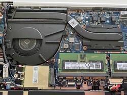 Förutom flera Philips-skruvar hålls höljets botten också av flera plastklämmor, av vilka vissa är fästa mycket tätt. Så du måste vara mycket försiktig så att du inte skadar dem när du tar bort botten. Inuti får du tillgång till batteriet, fläkten, de två kommunikationsmodulerna och M.2 SSD, samt de två platserna för arbetsminnet. Det finns ett extra lock för SSD och RAM, men detta är bara inskjutet och kan enkelt tas bort. Sammantaget är underhållsalternativen bra.