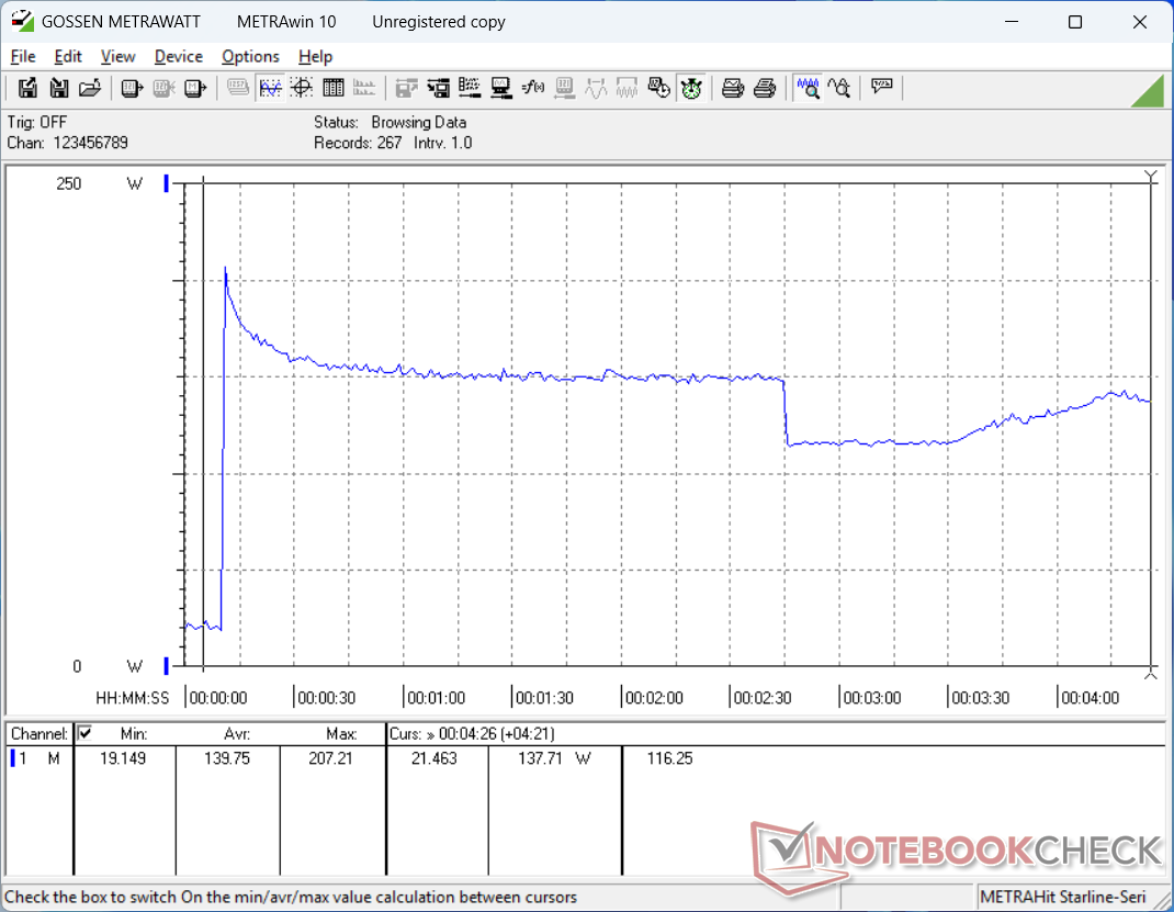 Tomgångskörning på skrivbordet kan kräva så mycket som 25 W jämfört med endast 16 W på den mindre utrustade RTX 2000-konfigurationen. När du kör krävande belastningar som spel kan deltaet vara så stort som 80 W för en 55-procentig ökning av förbrukningen. Se till att du använder den mer kapabla 230 W AC-adaptern för att få ut mesta möjliga av RTX 4000-konfigurationen.