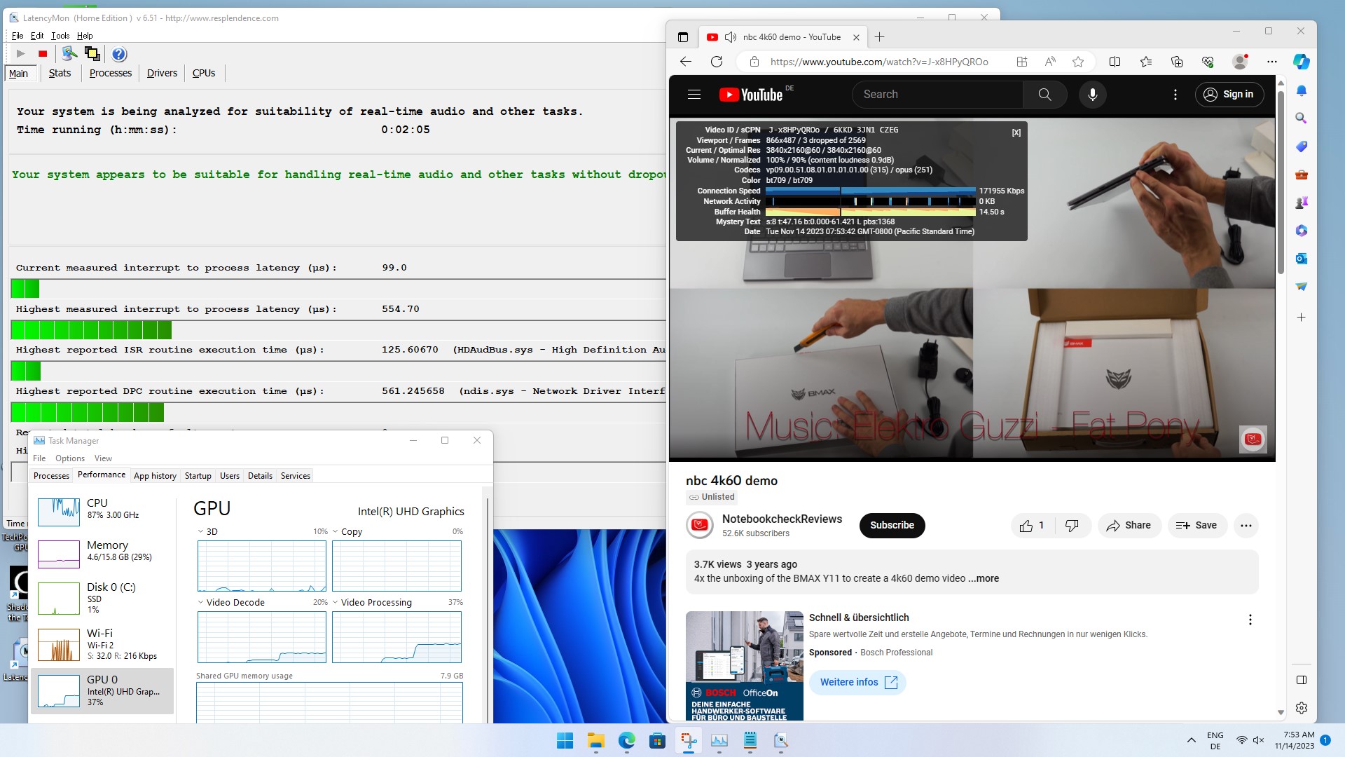 | DPC Latencies / LatencyMon - interrupt to process latency (max), Web, Youtube, Prime95 | |