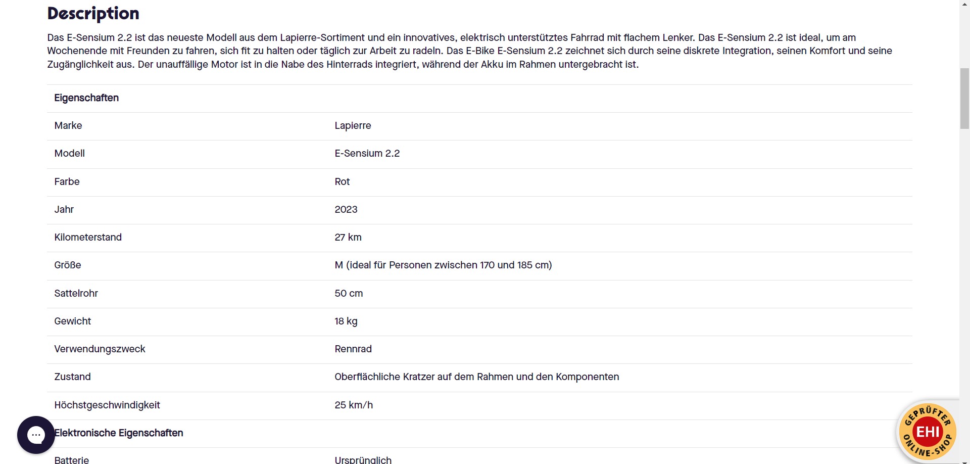 Den äldsta elcykeln på webbplatsen är från 2014 och därmed redan nio år gammal, men det finns även cyklar från 2023. Körsträckan är lika varierande och sträcker sig från 2 till 13 679. Vi valde en Lapierre E-Sensium 2.2 från 2023, som sägs ha körts under 5 kilometer (~3,1 miles).