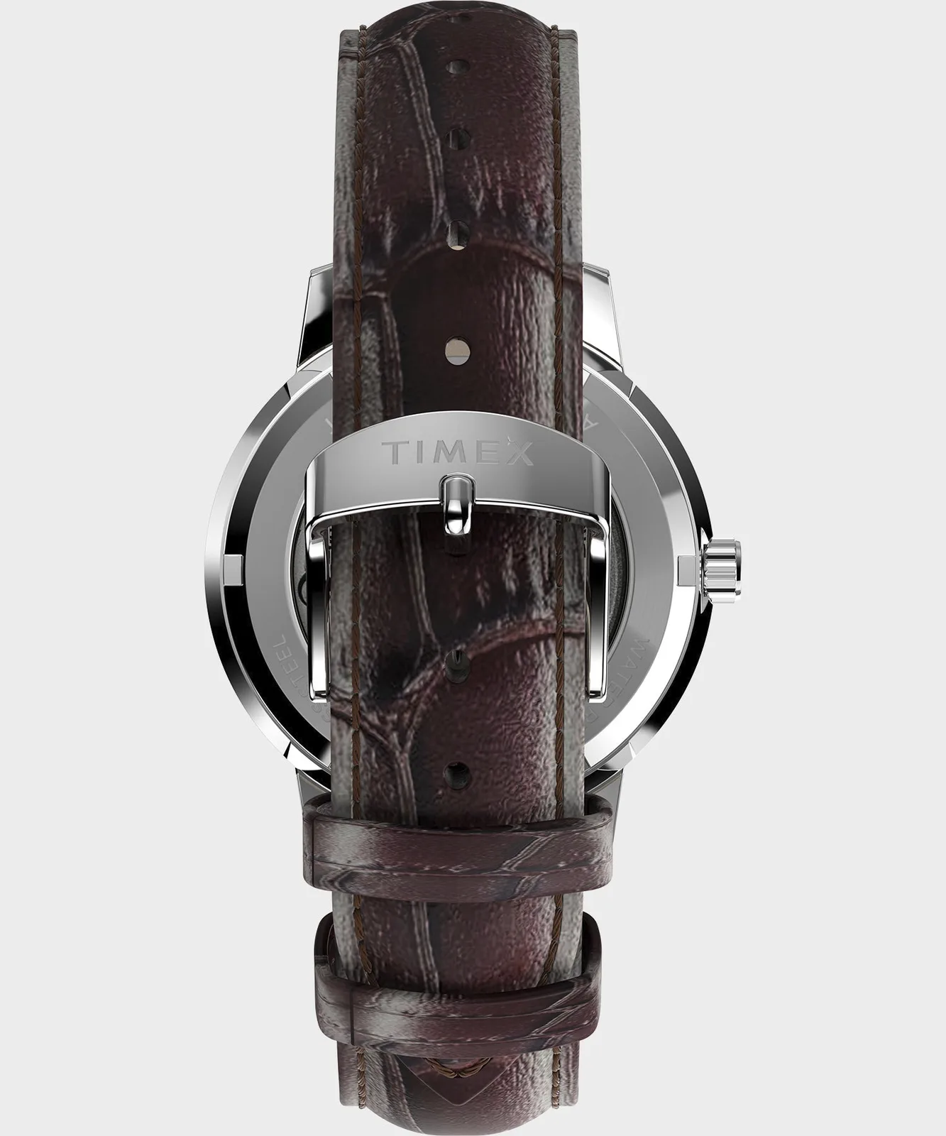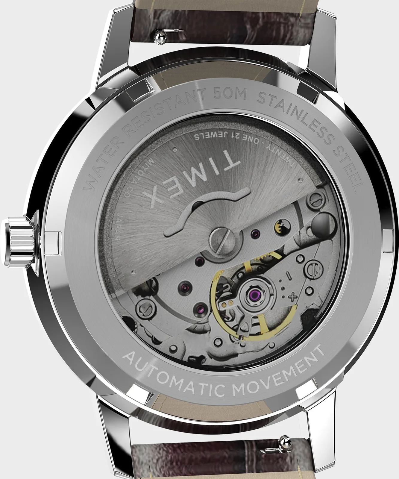 Den nya Olive Marlin Automatic är baserad på Timex Marlin-serie från 1960-talet, som var ett av företagets tidiga försök att skapa mekaniska klockor för mainstreamsegmentet under efterkrigstidens mekaniska boom. Modellen behåller originalets vintage-design, men har nu ett japanskt automatiskt urverk, synligt genom en utställningsbaksida. Rotorn är graverad med Timex ordmärke och urverket anges ha 21 juveler. Produktsidan avslöjar inte den exakta rörelsen, men Gear Patrol säger att det är en Miyota automatisk rörelse.