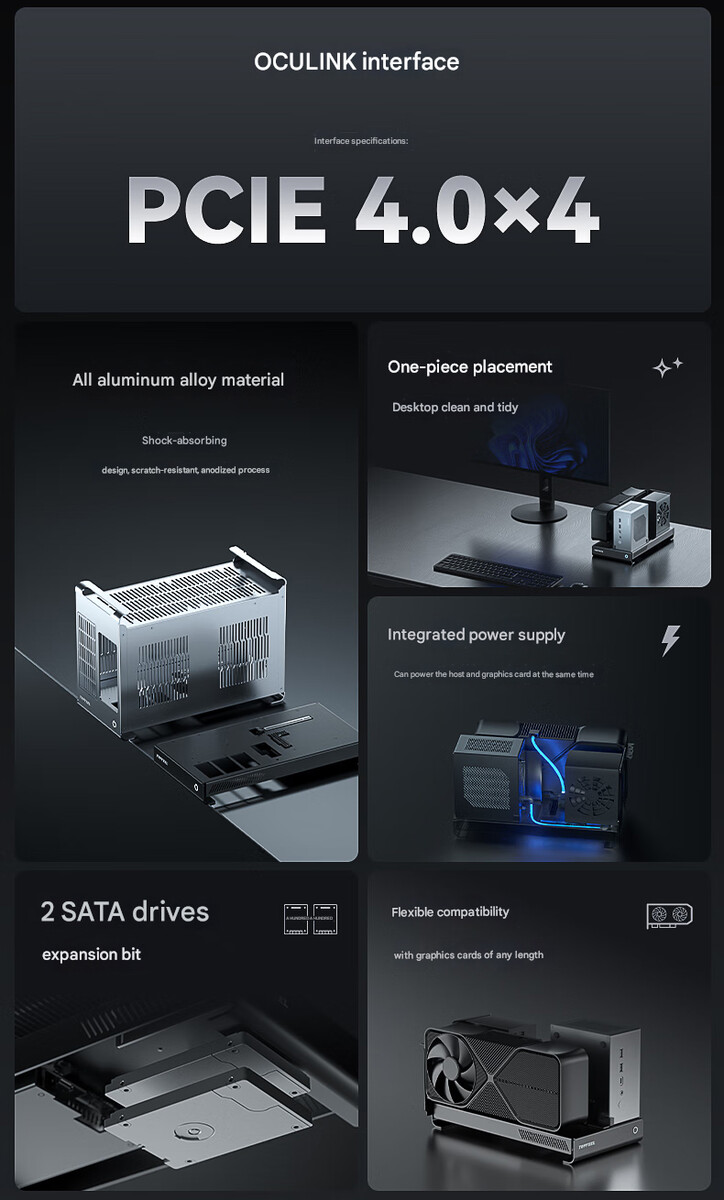 Topfeel har introducerat två nya eGPU-dockor i Kina, G1 och G1 Pro. Bland de två har G1 en öppen design, vilket gör den kompatibel med i stort sett alla stationära GPU:er. Dockans öppna natur gör också att den kan rymma en ATX PSU, men företaget rekommenderar en SFX-strömförsörjning för att få ett snyggare utseende.