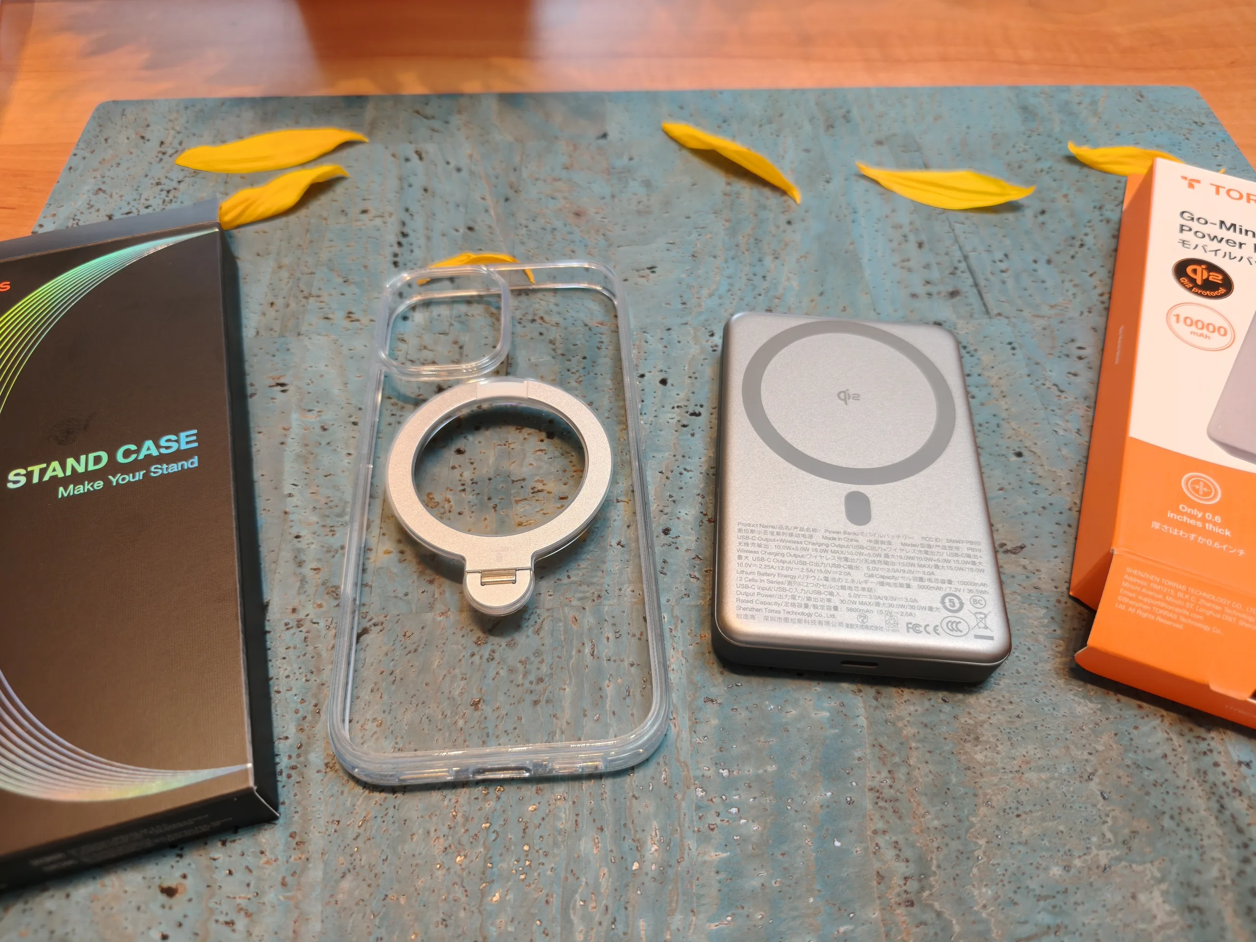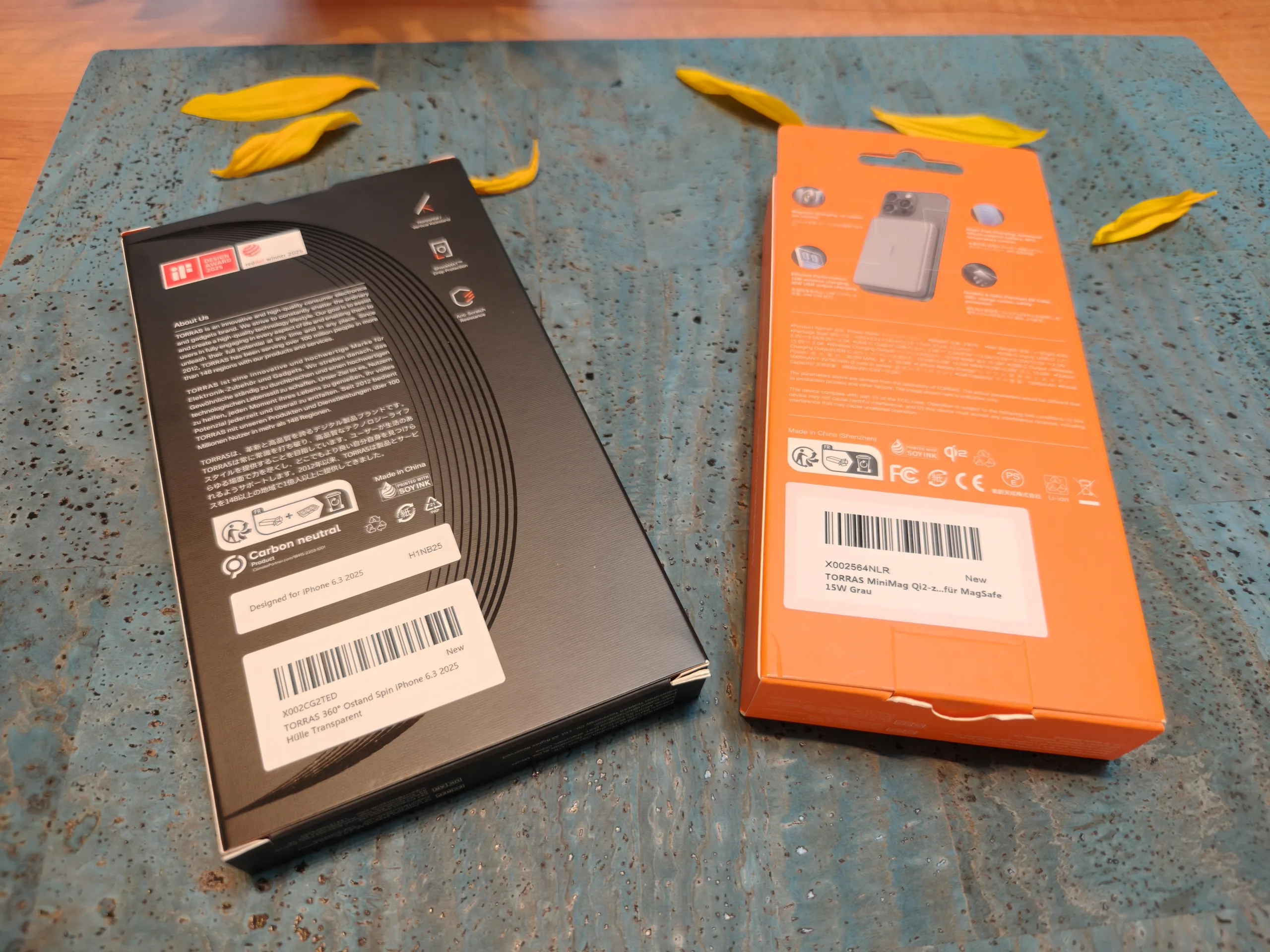 Torras mobilskal och powerbanks kommer i mycket tunna förpackningar som är tryckta med miljövänligt sojabläck. Tyvärr används fortfarande plastbrickor och plastfilmer på insidan.