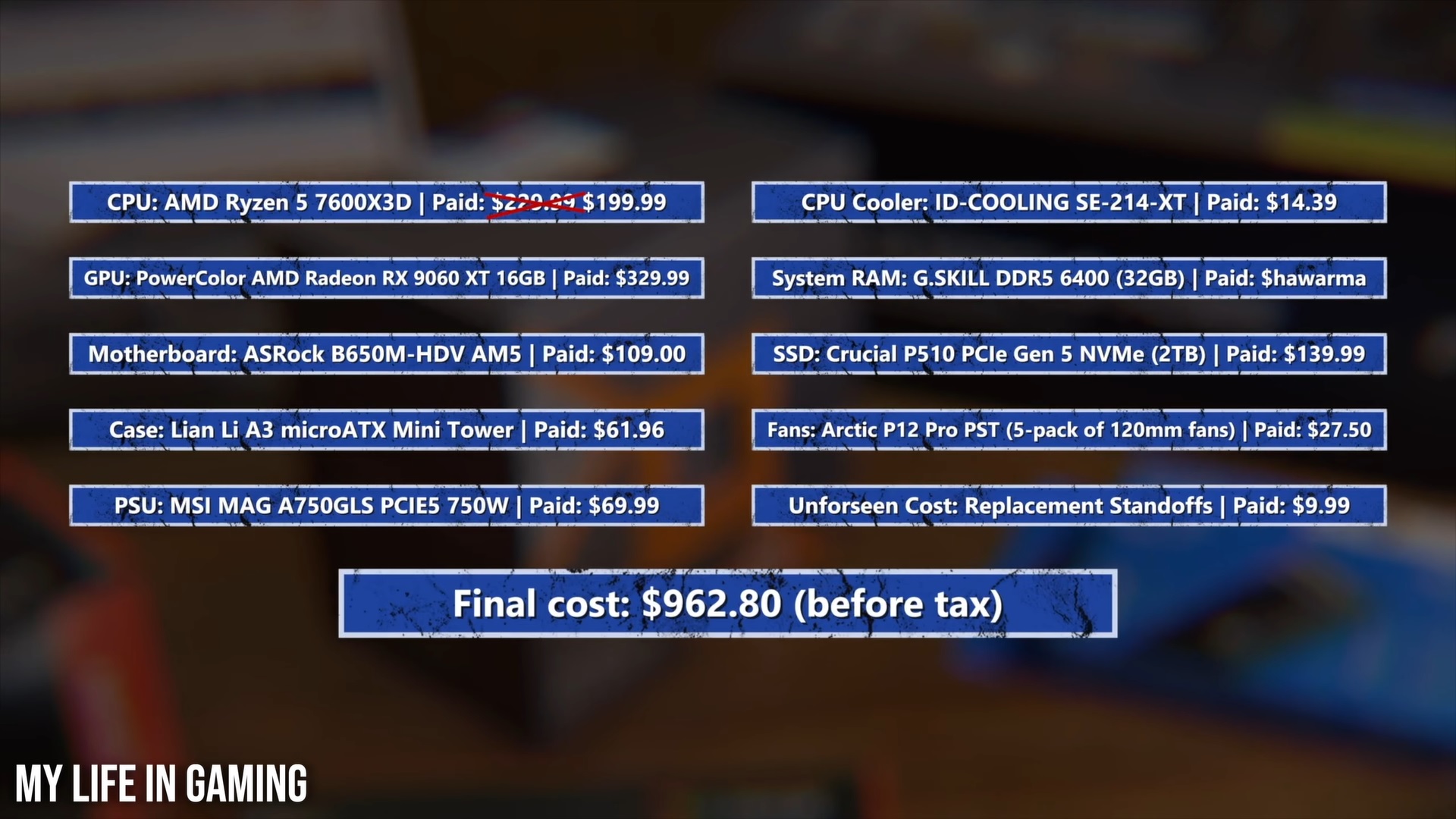 DF visade ett PS5 Pro-ekvivalent PC-bygge från YouTube-kanalen My Life In Gaming. Bygget kostade 963 dollar med en RX 9060 XT 16 GB, en Ryzen 5 7600X3D och 2 TB lagringsutrymme. Spel-PC: n inkluderade dock inte priset på 32 GB DDR5-6400-minne som den använde.