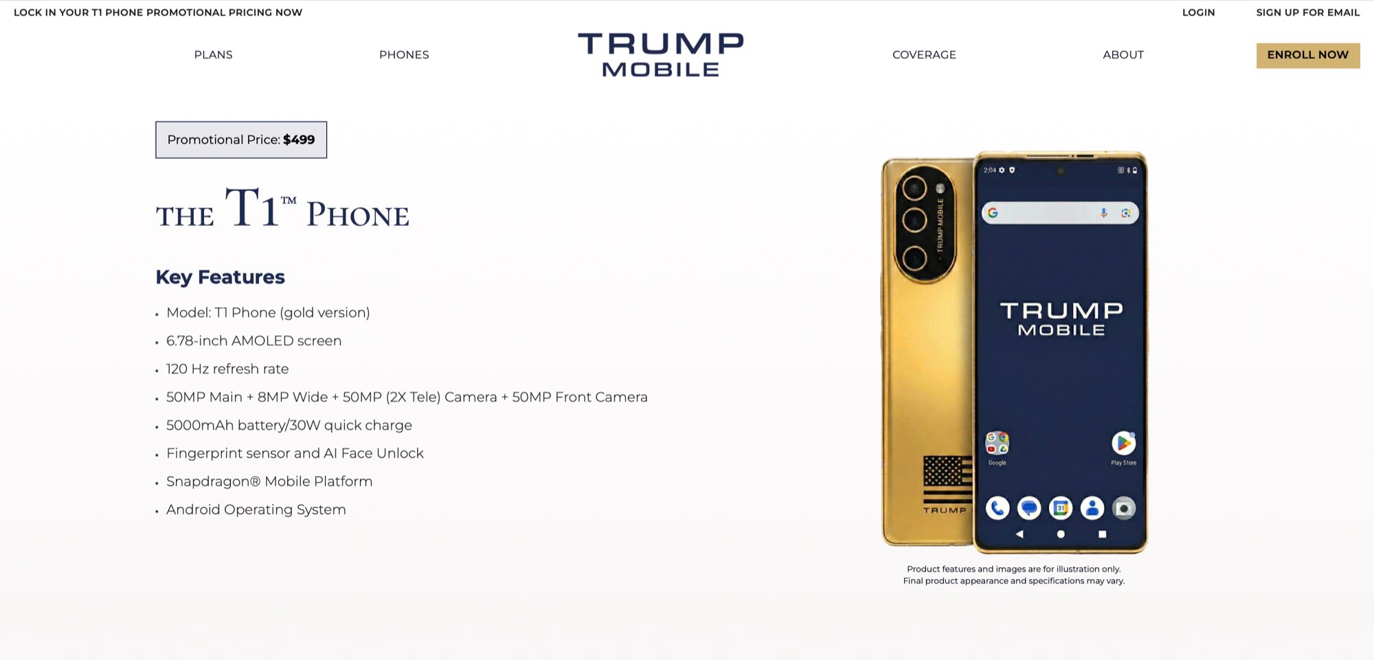 I motsats till vad som ursprungligen annonserades tillverkas Trump T1 Phone inte i USA och designen har sedan dess bytts ut mot en guldversion av Samsung Galaxy S26 Ultra(1 299 USD på Amazon) eller iPhone 16 Pro, ett leveransdatum har fortfarande inte bekräftats nästan ett år senare, och även specifikationerna har ändrats flera gånger. I februari avslöjade Trump Mobile äntligen den förmodligen slutliga designen. Nu visas en anpassad version av denna design på den officiella produktsidan tillsammans med specifikationer som har ändrats igen