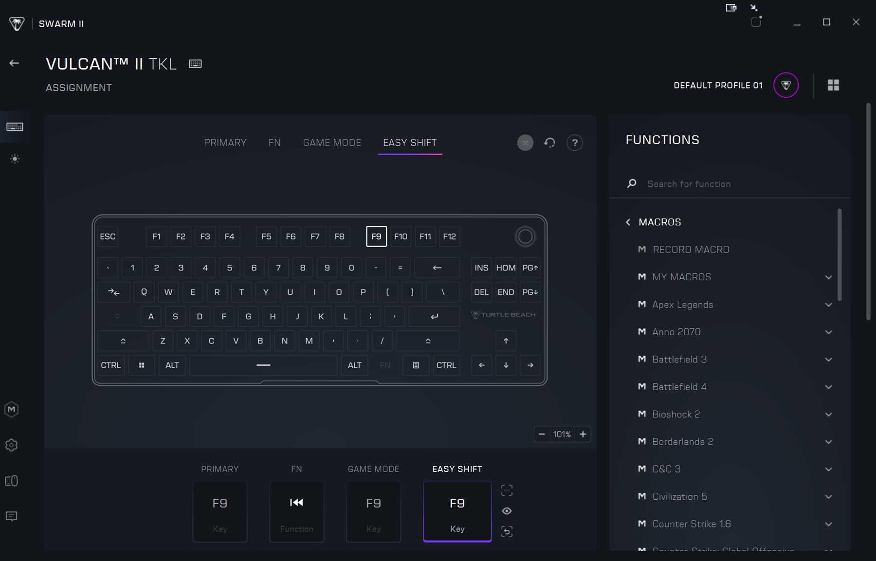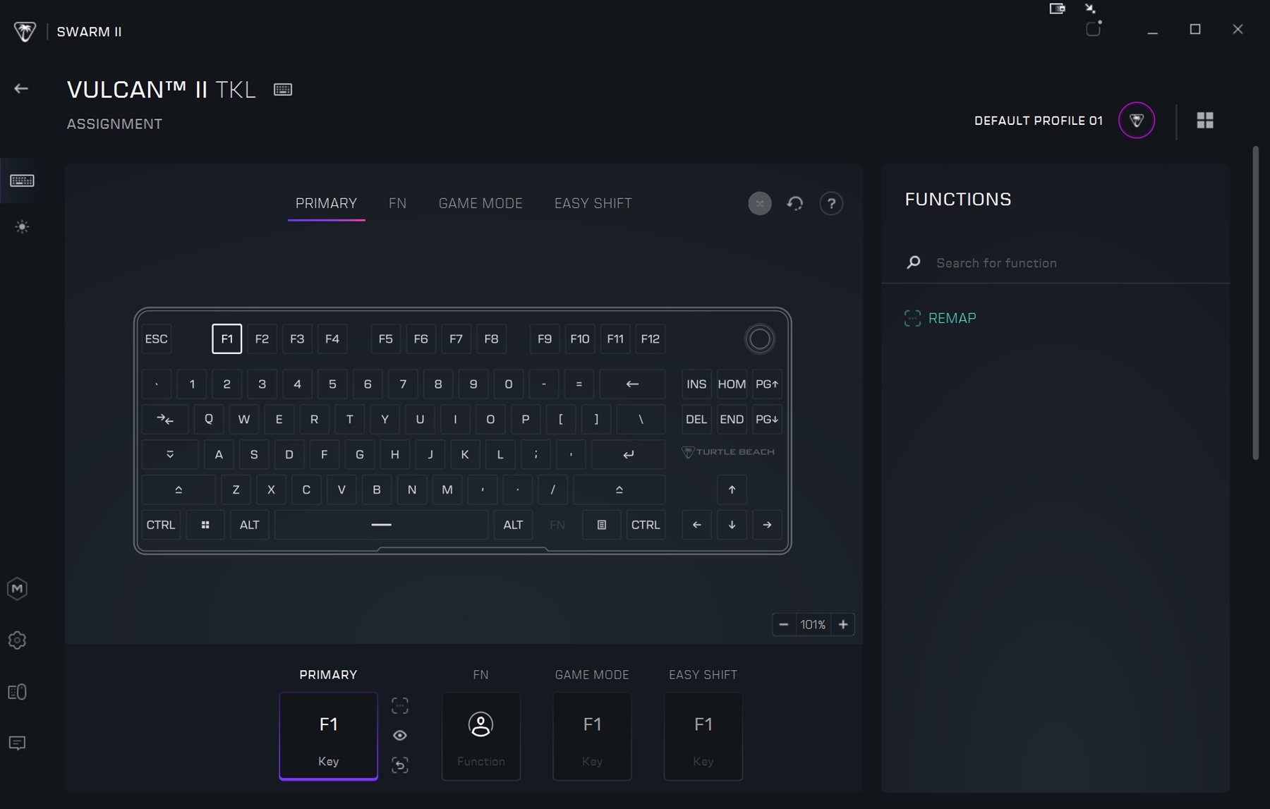 Swarm II är uppfriskande lätt jämfört med mer komplexa system som Razer Synapse. Det tog aldrig lång tid att byta flikar och det strömlinjeformade användargränssnittet är inte förvirrande. De flesta funktionerna med Vulcan II TKL är justerade i menyerna för tangenttilldelning och AIMO-belysning.