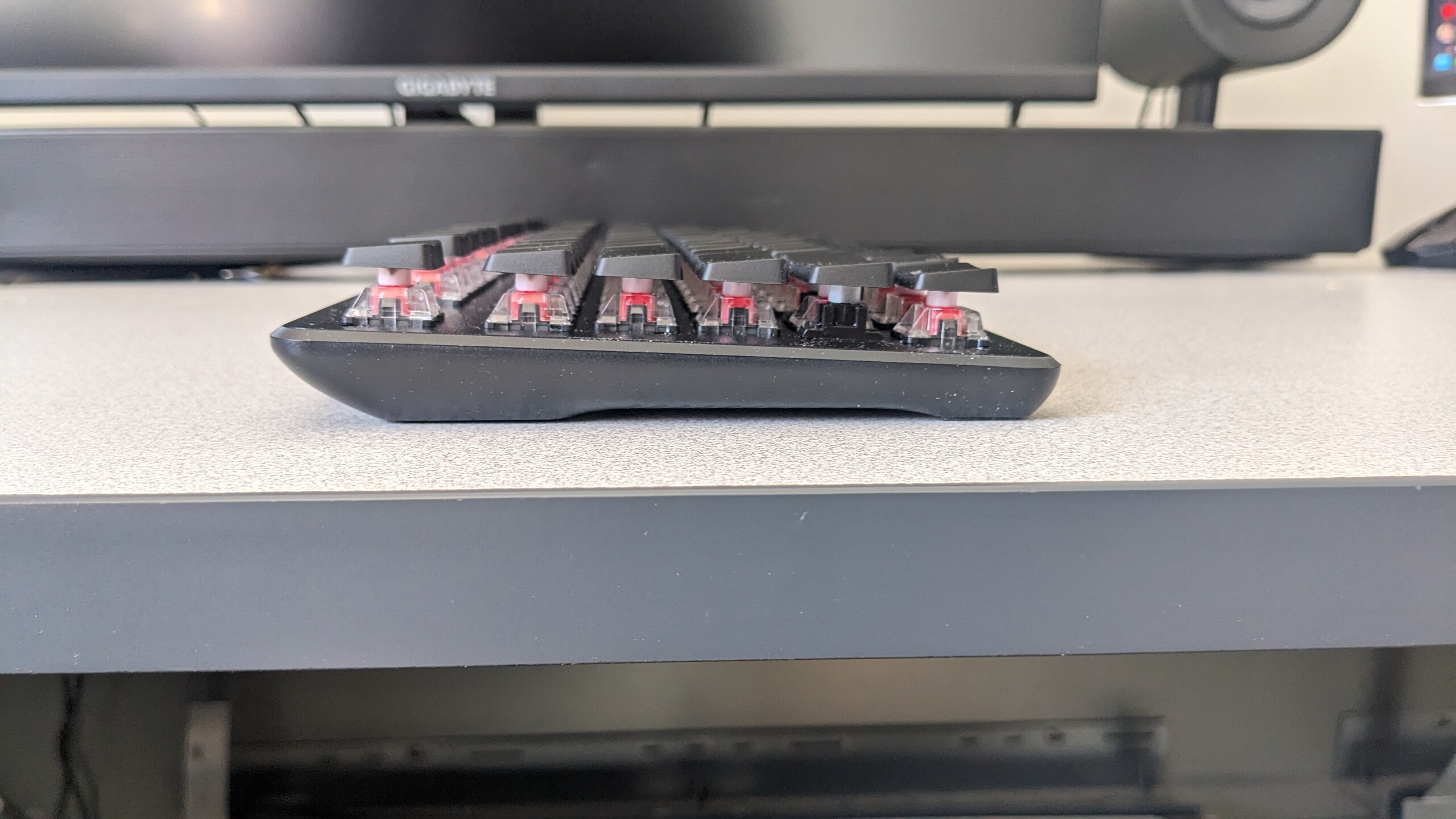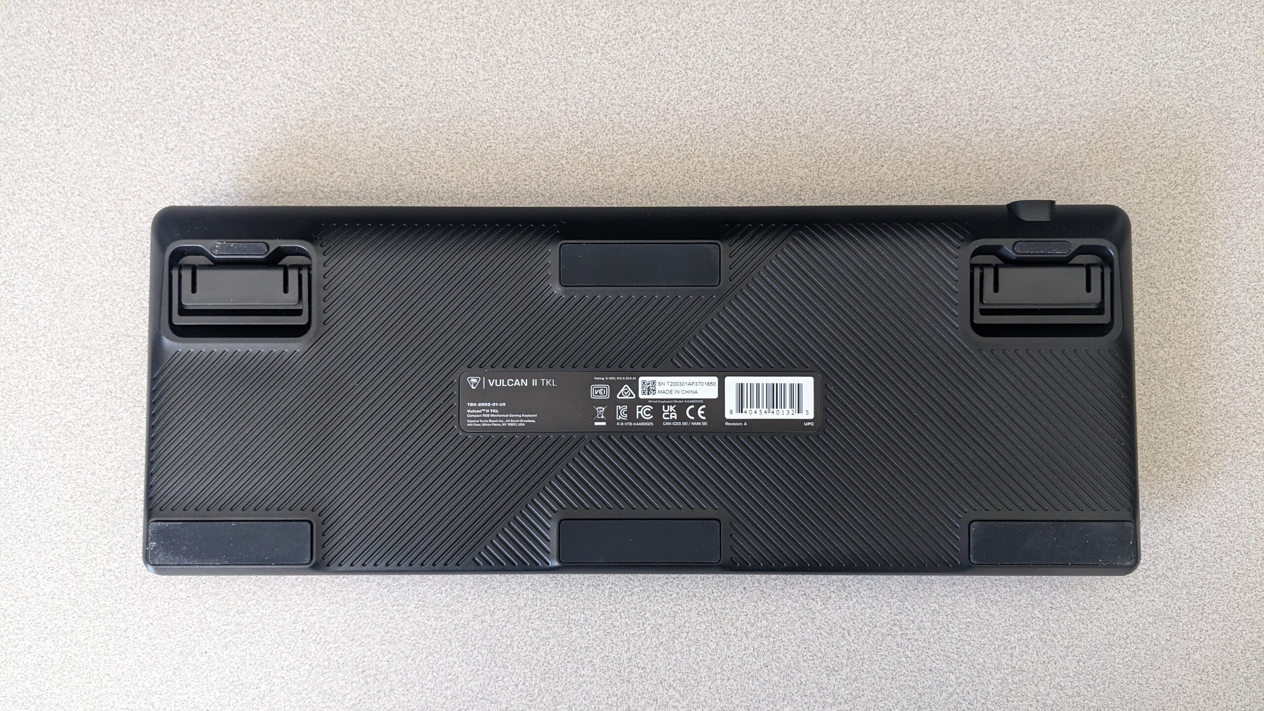 Vulcan II TKL delar flera egenskaper med ett lågprofilstangentbord. Dess hölje är endast 32 mm tjockt, även om de tunna knappsatserna sticker upp en bra bit över ytan. Justerbara stödben på undersidan ger mer ergonomisk flexibilitet.