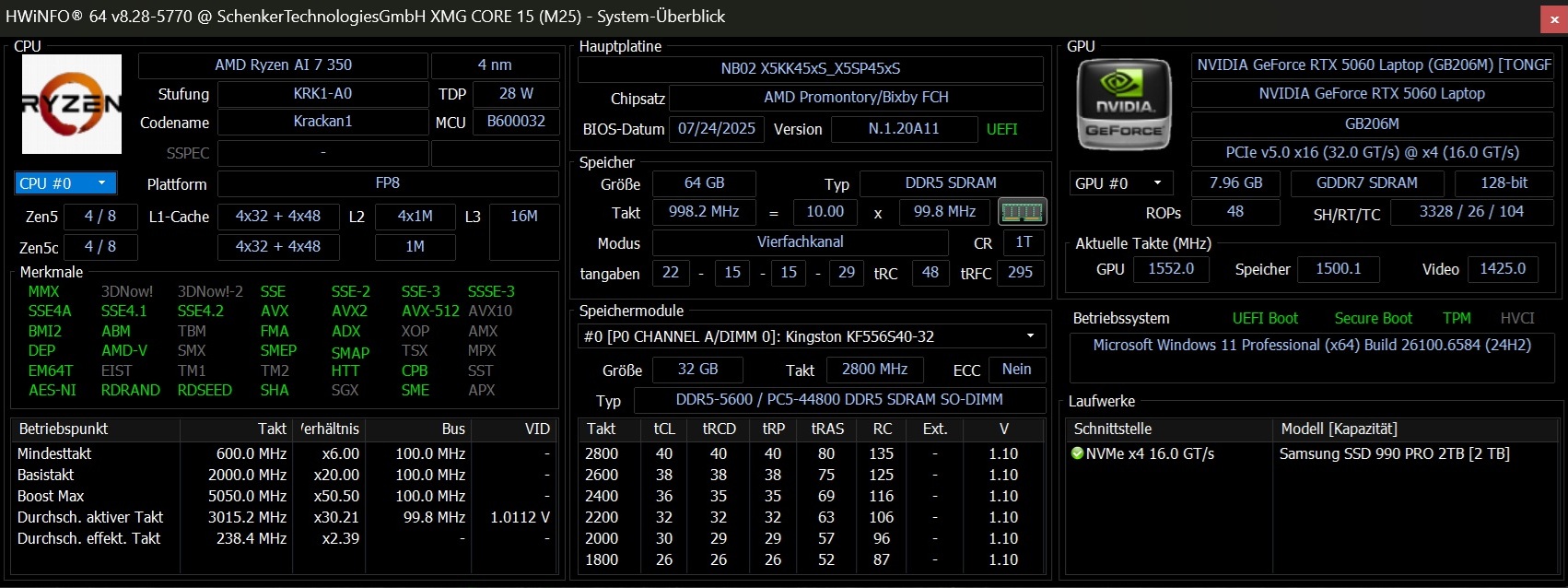 SCHENKER XMG Core 15 (M25) AMD Ryzen AI 7 350 ⎘ Nvidia GeForce RTX 5060 Laptop ⎘ 64 GB Minne, 2048 GB SSD | Listpris: 1840 EUR | 1.9 kg | 22 mm | 15.30" 2560x1600 197 PPI IPS | |