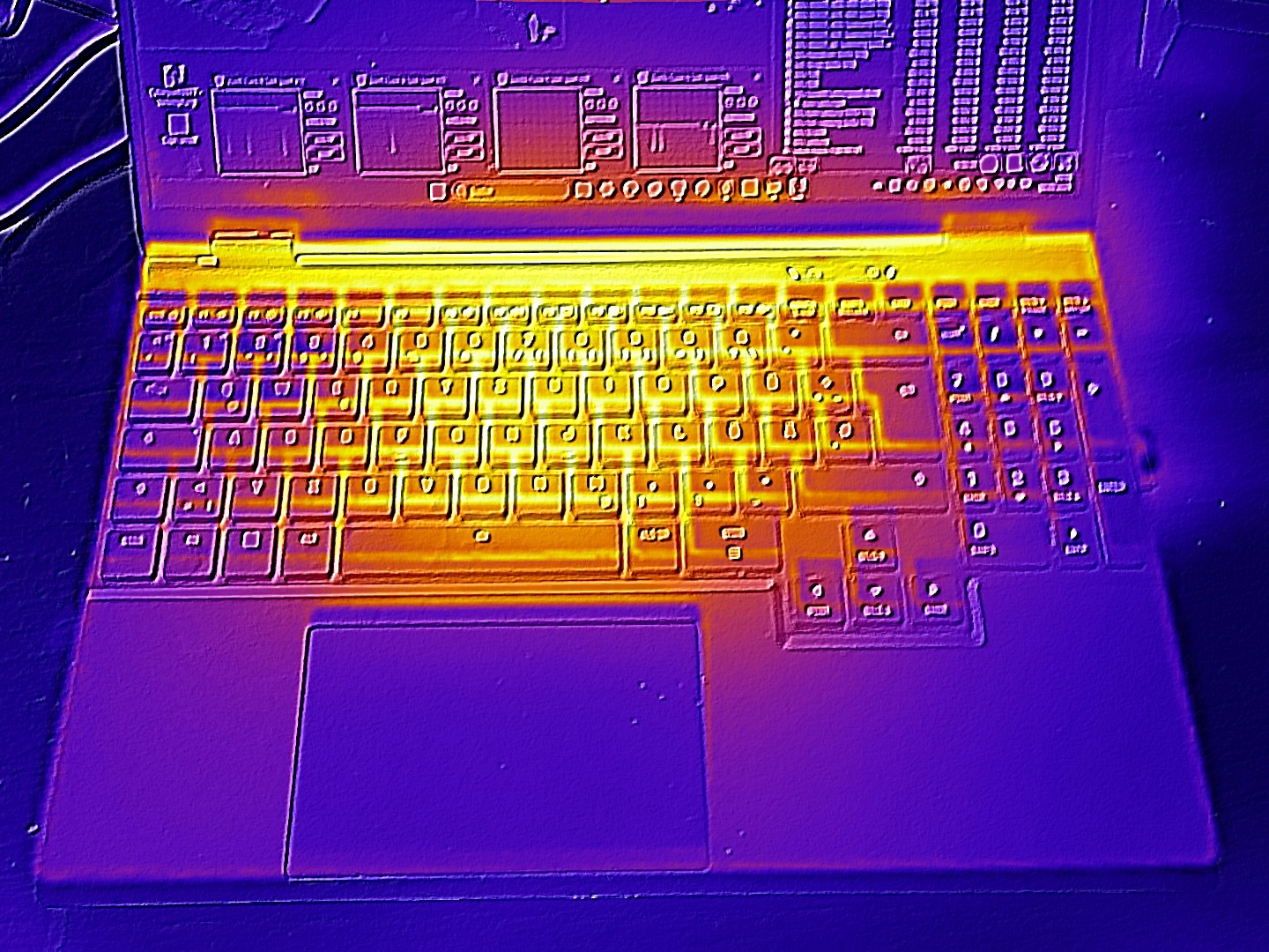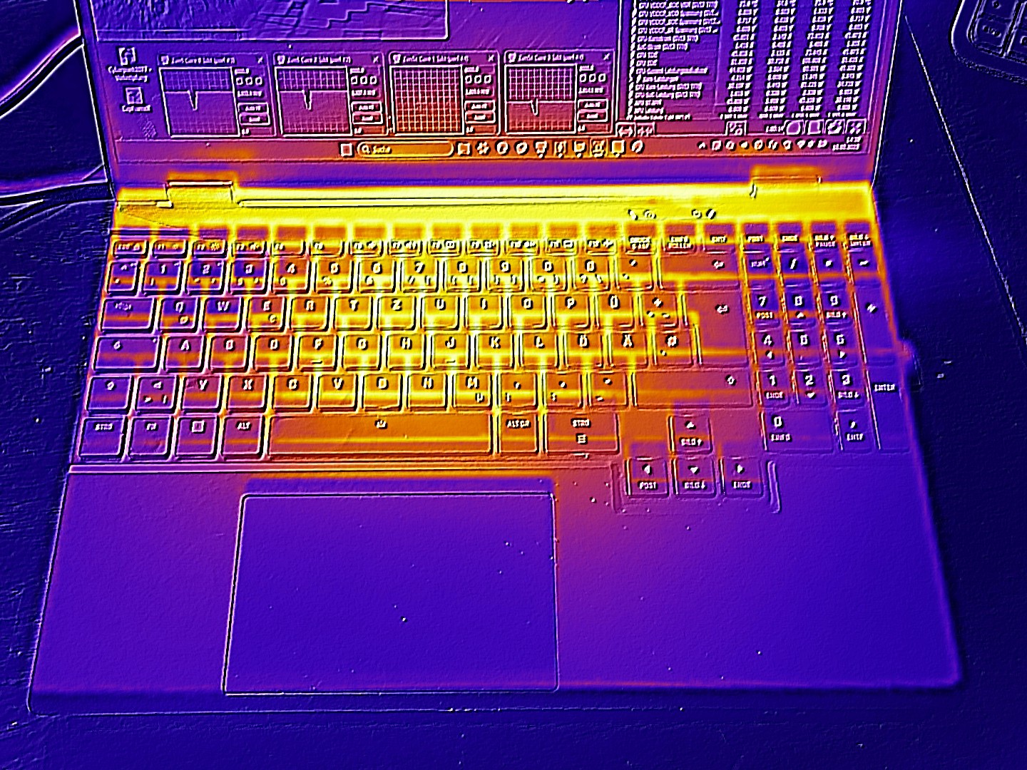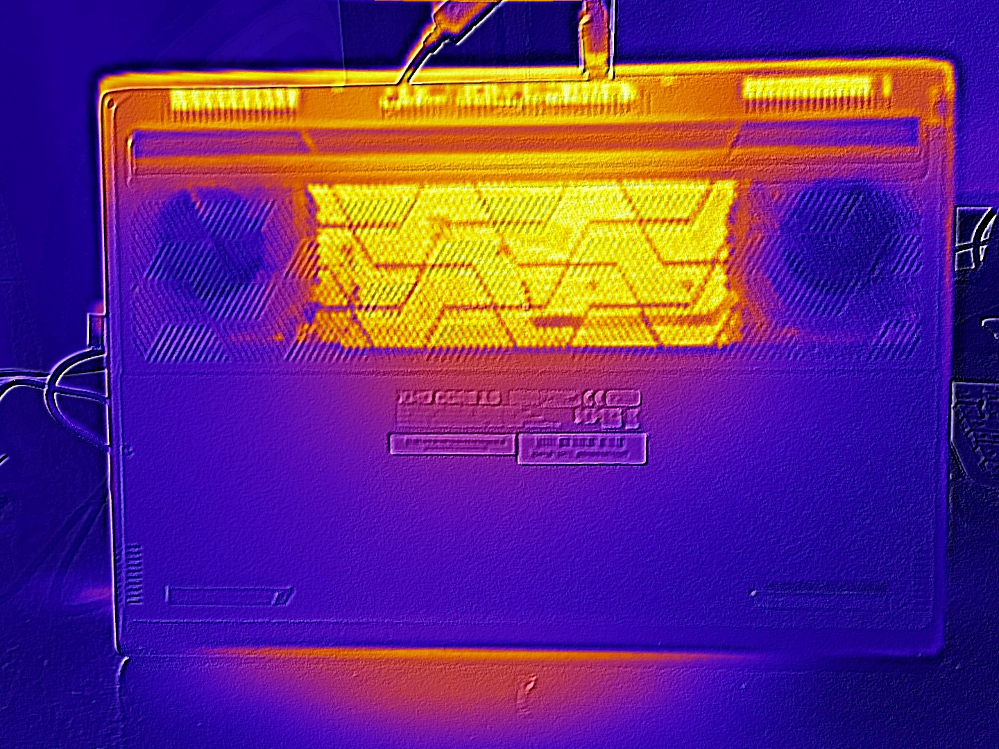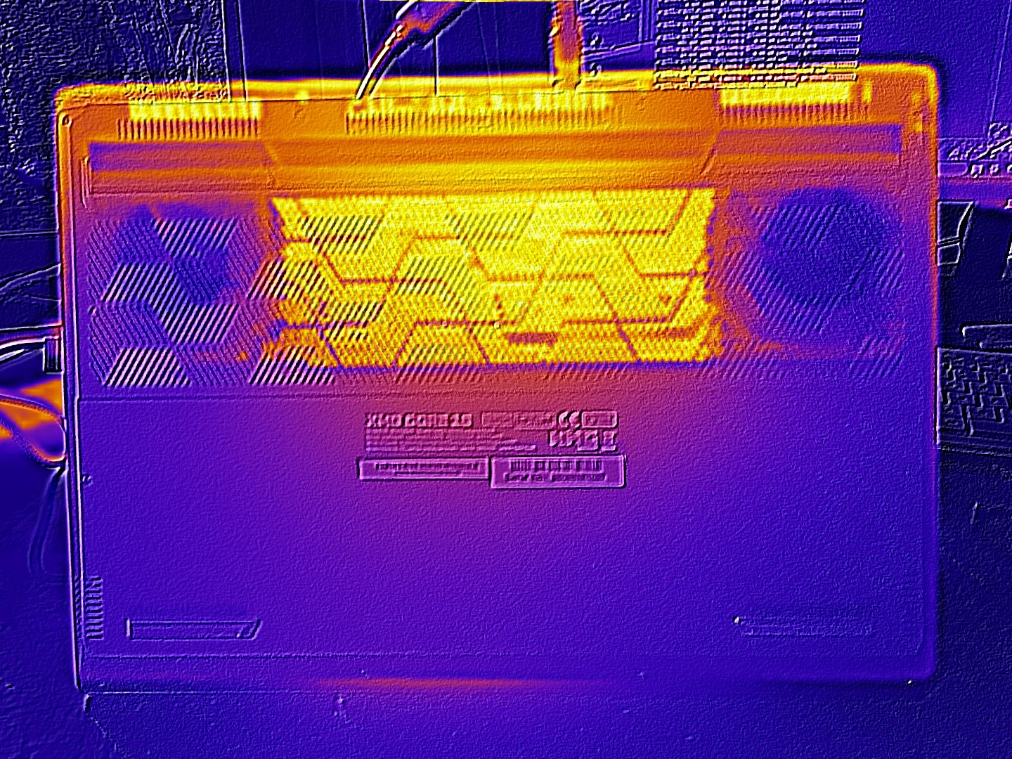 Temperaturresultaten är blandade. Medan chassit mestadels håller sig under 30 °C vid tomgång, stiger yttemperaturerna till nästan 50 °C på ovansidan och 60 °C på undersidan under belastning. Dessa avläsningar liknar Lenovo LOQ 15, medan Legion 5 är svalare.