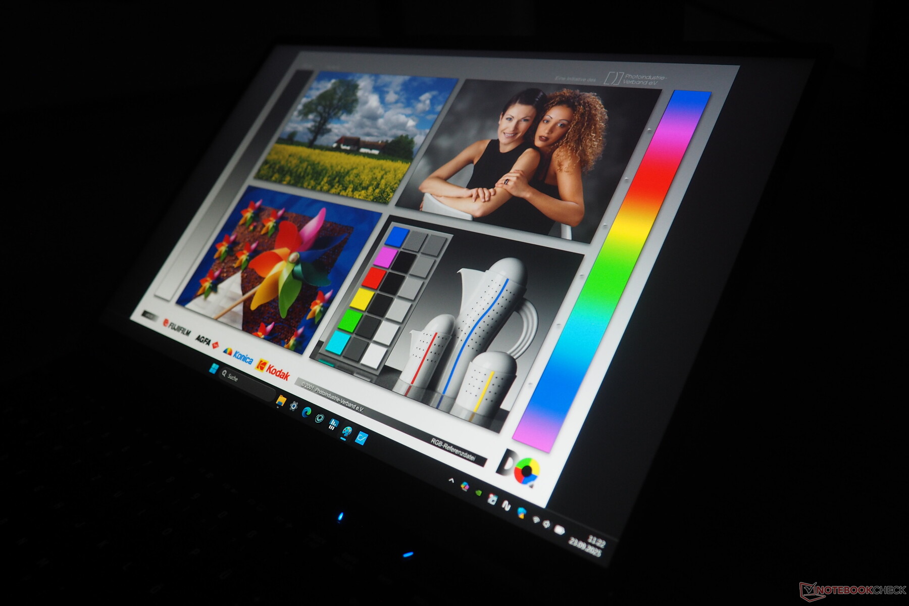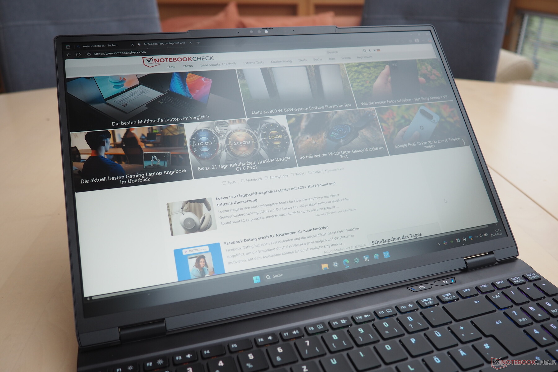 Tillverkaren valde en IPS-panel för skärmen, som är lämplig för ljusare rum och tillfällig utomhusanvändning med ett genomsnitt på 530 cd/m². Eftersom svartnivån inte är riktigt lika perfekt (0,54 cd/m²) når kontrasten bara upp till cirka 1.000:1. OLED-panelen på Legion 5 klarar detta mycket bättre, men den måste kämpa med starka reflektioner. Köpare måste nöja sig med sRGB för färgrymden, eftersom DCI-P3 och AdobeRGB inte är helt täckta. Färgnoggrannheten är dock redan bra ut ur lådan.