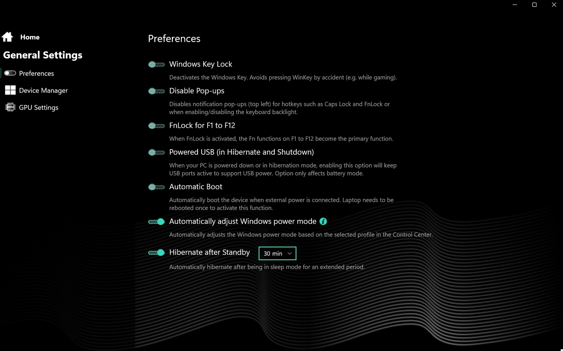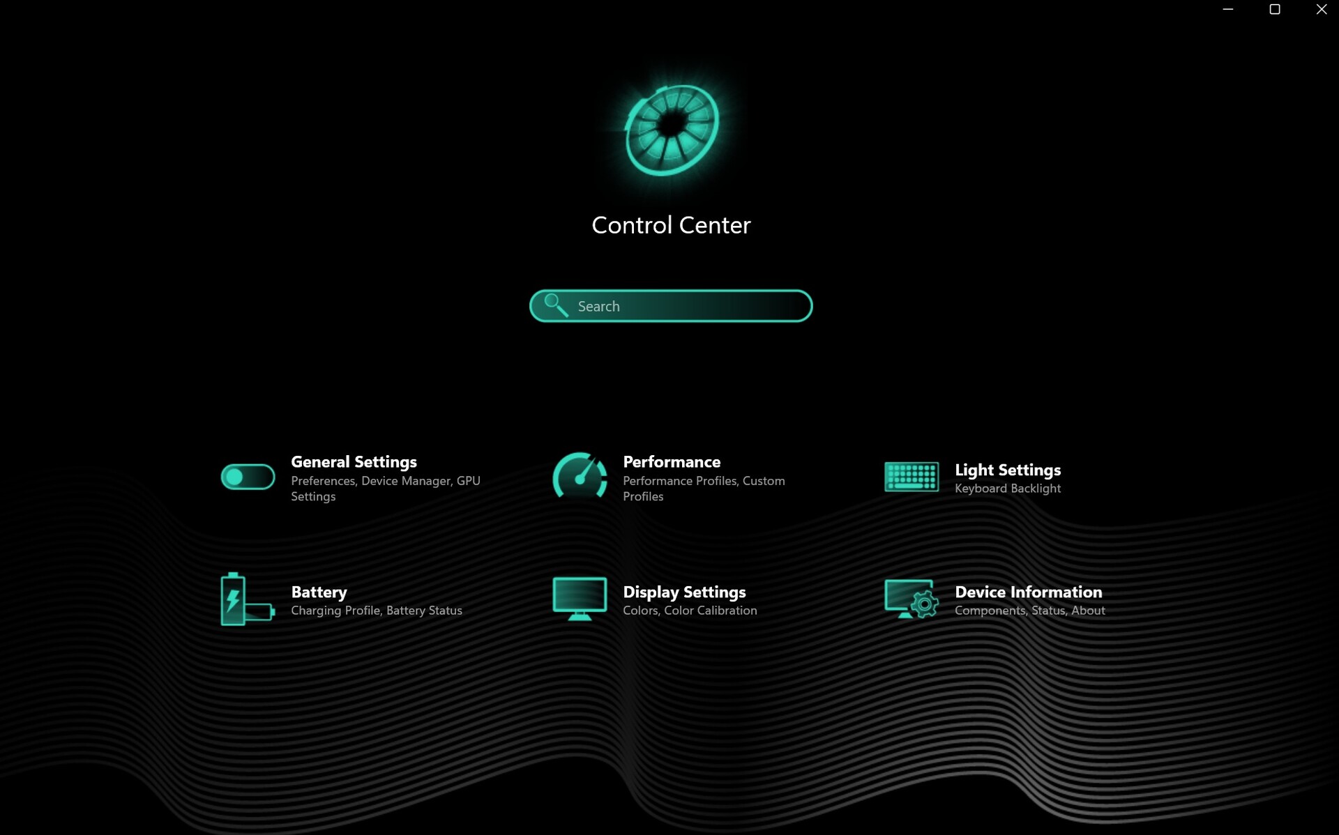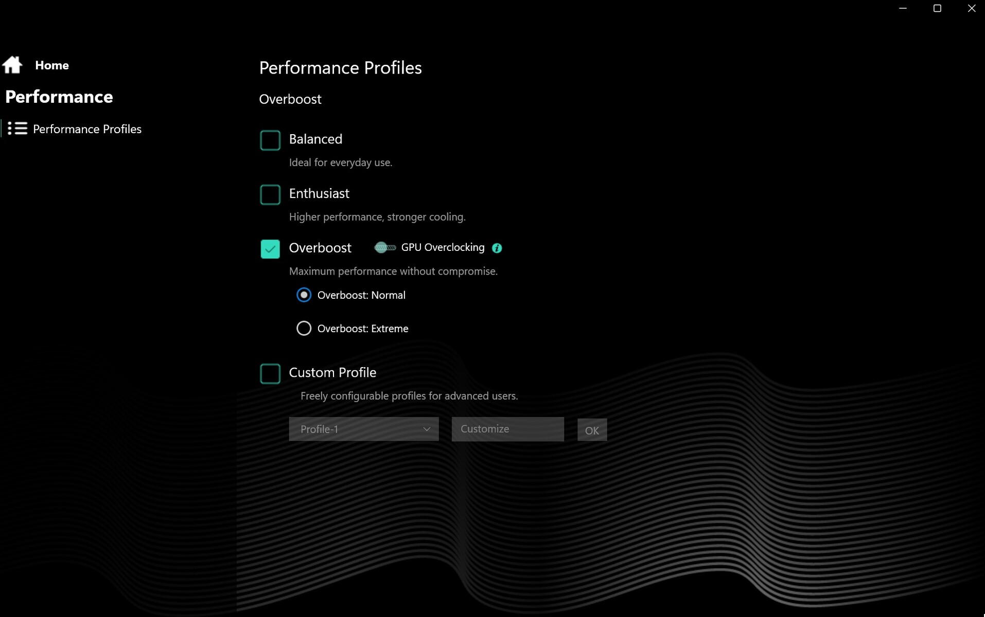 Det förinstallerade Control Center erbjuder en mängd olika funktioner och inställningar. Spelare kommer att vara mest intresserade av prestandamenyn, som innehåller tre profiler (se tabell). Med undantag för batteritestet gjordes alla mätningar i Overboost-läge med GPU-överklockning inaktiverad. En anpassad profil kan också skapas om så önskas.