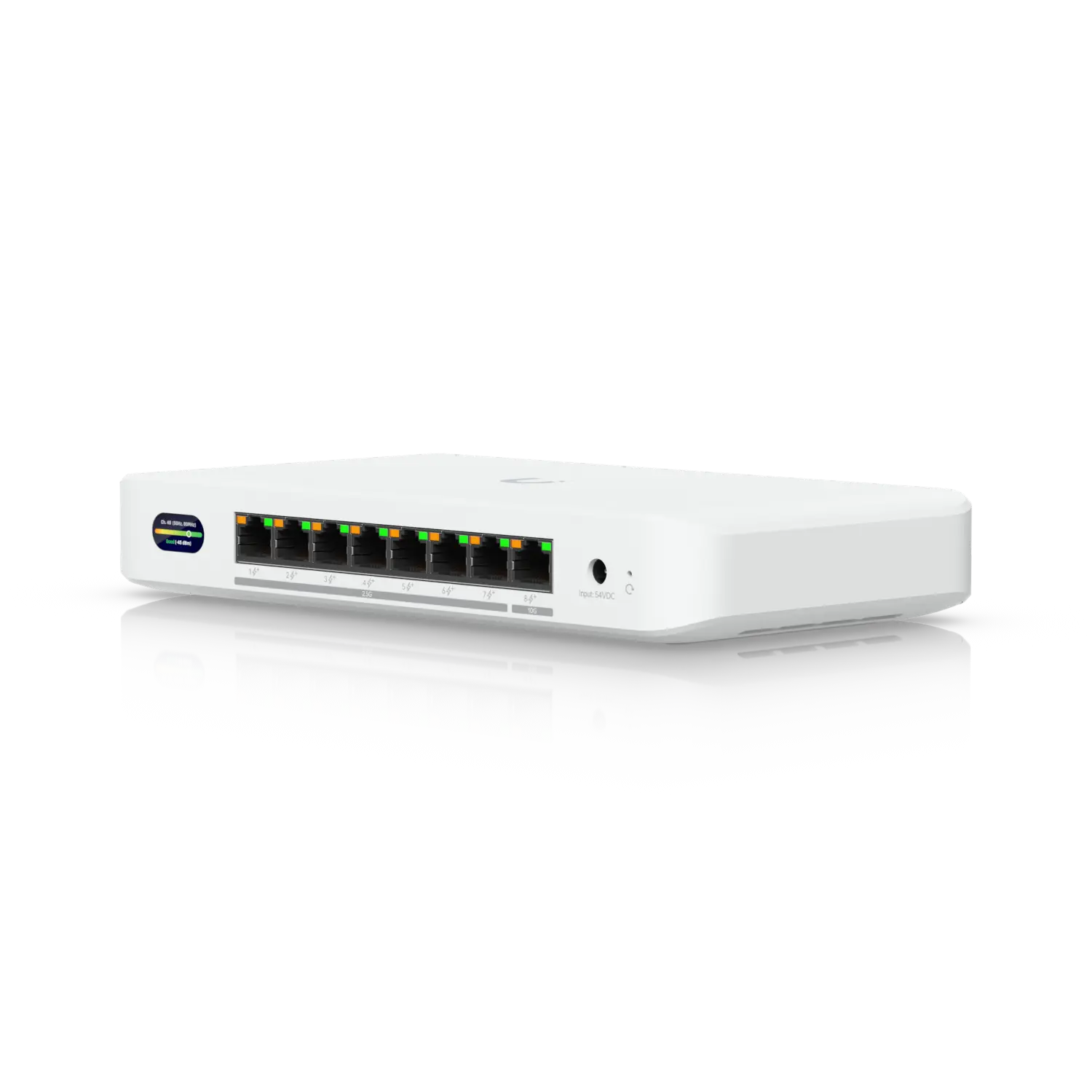 Switchen i sig behöver 25 watt ström, men den levererar också 185 watt till anslutna strömförsörjda enheter. Dessa kan anslutas till åtta RJ45-portar. PoE+ (även känd som IEEE 802.3at) med upp till 30 watt finns också tillgängligt. Det bör noteras att Ubiquiti endast inkluderar ett 60 watts nätaggregat med switchen, vilket minskar dess effektbudget till endast 35 watt. Användare som behöver mer än så bör beställa den valfria strömförsörjningen med 210 watt.