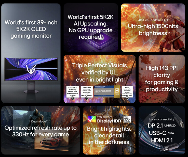 För att sammanfatta hade LG redan bekräftat att UltraGear OLED 39GX950B skulle ha en bildfrekvens på 5 120 x 2 160 (5K2K) med en uppdateringsfrekvens på 165 Hz. Enligt företagets kanadensiska webbplats kan bildskärmen skala upp innehåll till 5K2K utan inmatning från en enhet som är ansluten via DisplayPort 2.1-, HDMI 2.1- och USB Type-C-portarna. Alternativt kan bildskärmen dubbla sin uppdateringsfrekvens genom att sänka upplösningen till 1080p (2 560 x 1 080). Den böjda bildskärmen 1500R sägs dessutom leverera 335 nits SDR och 1 500 nits HDR (APL 1,5%) maximal ljusstyrka med 99% DCI-P3 färgrymdstäckning.