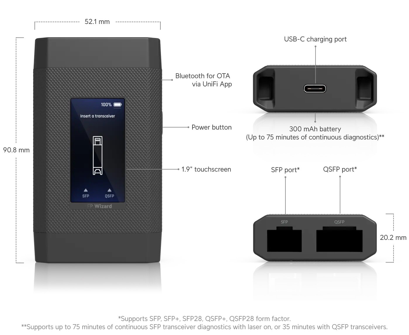 Enheten gör det möjligt för användare att förbereda SFP- och större QSFP-moduler för användning med andra switchar. För att göra detta innehåller SFP-guiden två modulplatser av motsvarande storlek. Enligt Ubiquiti har dess 1,1Wh-batteri en drifttid på 75 minuter utan extern ström. En pekskärm kan vara praktisk vid programmering av modulen. Enheten mäter cirka 2 x 3,5 tum och väger 3 oz, och är tillräckligt kompakt för att passa i de flesta fickor.
