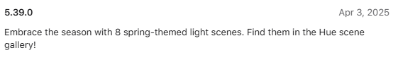 Philips Hue-appen version 5.39.0 innehåller åtta nya smarta belysningsscener under kategorin "Spring Breeze". Bland standardscenerna finns Crocus, Blossom, Spring Lake, Spring Blossom, Precious, Narcissa och Baby's Breath. Dessa övergår mellan olika färger, till exempel innehåller Crocus grön, gul, orange, rosa och lila belysning.