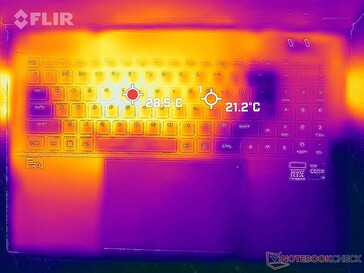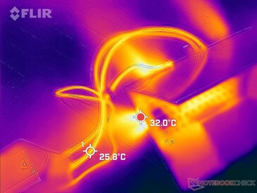 Yttemperaturen är den svalaste vi någonsin har registrerat på en bärbar dator för spel. Vid 100 procent CPU- och GPU-användning når de varma punkterna på toppen och botten endast 32 C respektive 30 C, jämfört med 50 C till 60+ C på MSI Stealth GS77. Den genomsnittliga temperaturökningen är endast cirka 3 C jämfört med ett tomgångstillstånd. Kylboxen är anmärkningsvärd när det gäller att hålla temperaturen i schack.