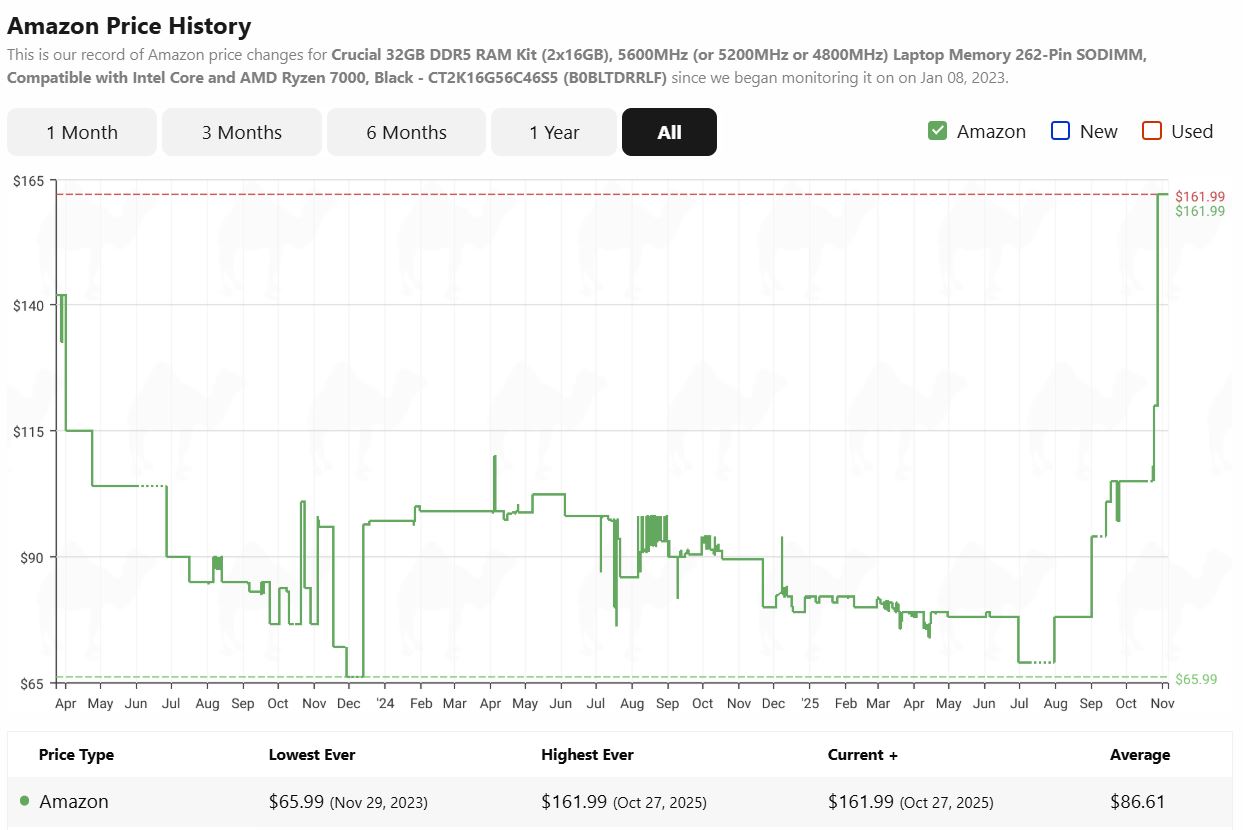 Till exempel säljs det mest sålda minnespaketet på Amazon, 32 GB DDR5-5600-satsen från Crucial, för närvarande för $ 161,99, en 2,75x ökning jämfört med $ 65,99 hela tiden lågt pris från november 2023 (via camelcamelcamel).