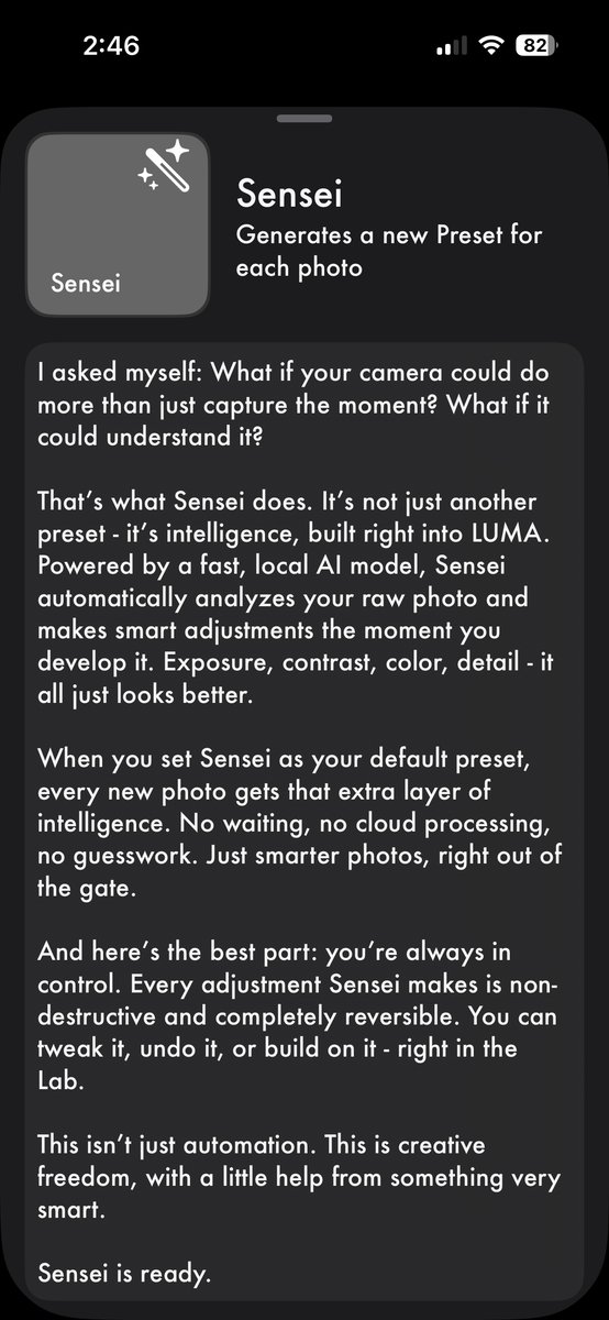 A: Idén med förinställningar är ganska central för Luma, eftersom den gör det möjligt för människor att skapa snabba go-to-styles, vilket potentiellt kan utöka deras kreativa produktion ... Det som skiljer Luma åt här är att dessa förinställningar kan ställas in direkt i kameran, så att de redan tillämpas på fotografiet när användaren är redo att framkalla bilderna från den sessionen. Det är en tidsbesparing.