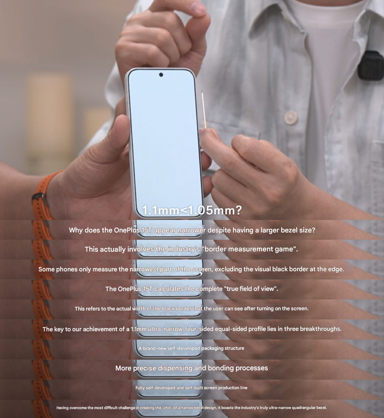 När fokus flyttades till framsidan pratade OnePlus om smarttelefonens ramar. De är 1,1 mm tjocka, men varumärket hävdar att gränserna kommer att se tunnare ut än en telefon med 1,05 mm ramar. Det är resultatet av en helt ny förpackningsstruktur, med mer "exakt dispensering och limningsprocess"