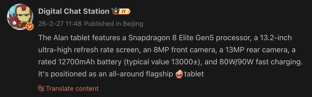 Dessutom pekar läckan på en 13MP bakre kamera och en 8MP selfie-kamera. Den kan drivas av Snapdragon 8 Elite Gen 5som är Qualcomms senaste flaggskeppsprocessor. Vivo Pad 6 Pro är tippad att ha ett batteri i 13 000 mAh-serien, upp från 12 050 mAh på sin föregångare. Det kan också stödja snabbladdning på upp till 90W (10K Iniu powerbank curr. $ 20 på Amazon).