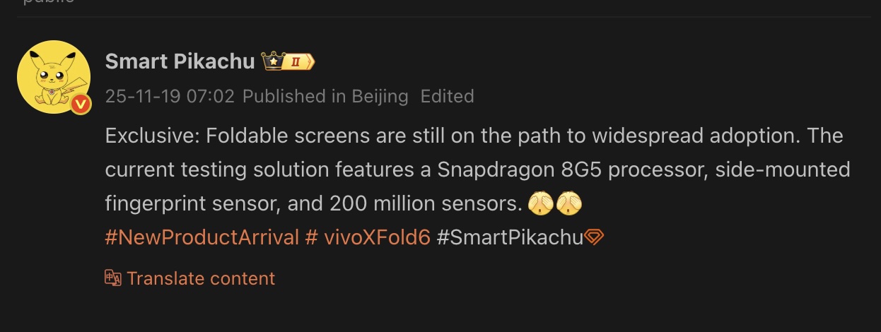 Tipsaren föreslår också att den kommer att ha en sidomonterad fingeravtrycksläsare. Andra specifikationer förblir ett mysterium för tillfället. Vivos flaggskepp vikbar smartphone tippas att släppas under Q2 2026.