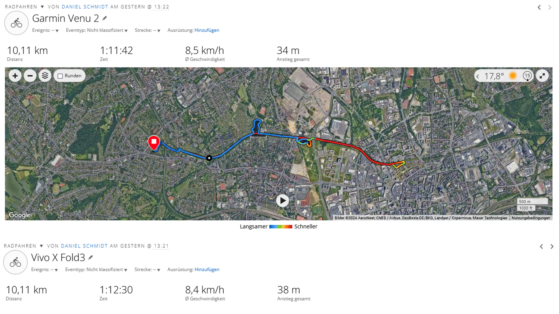 X Fold3 kan använda globala satellitnätverk i dualband för att bestämma sin position. På en cykeltur tog vi en titt på positioneringskvaliteterna i jämförelse med en Garmin Venu 2. Även om det totala avståndet som vi fastställde på Vivo Phone är identiskt med Garmin-klockan, kan man se mindre felaktigheter i den detaljerade rutten.